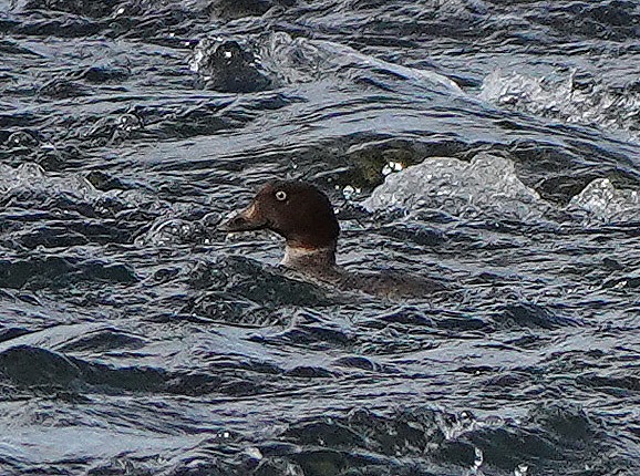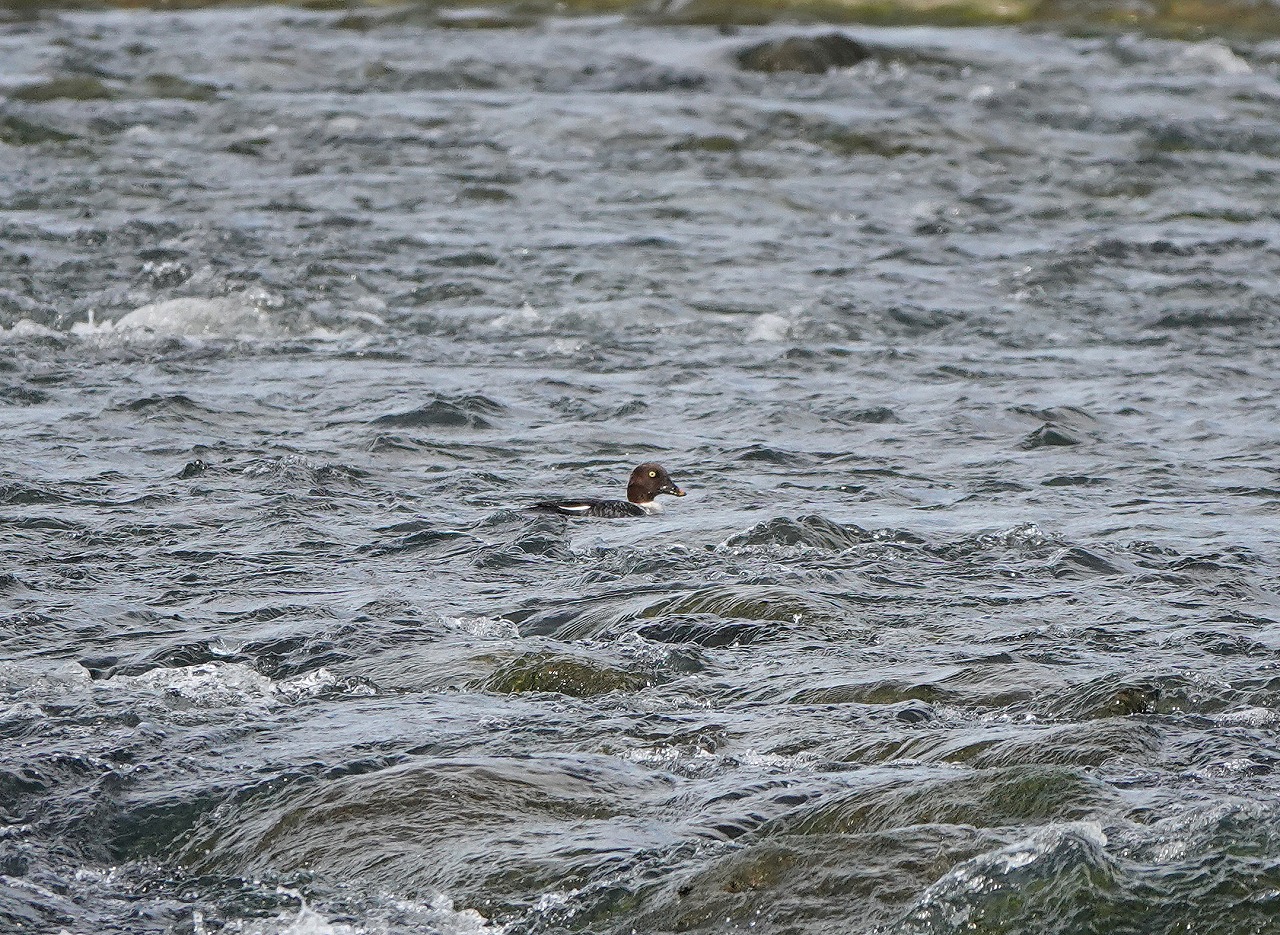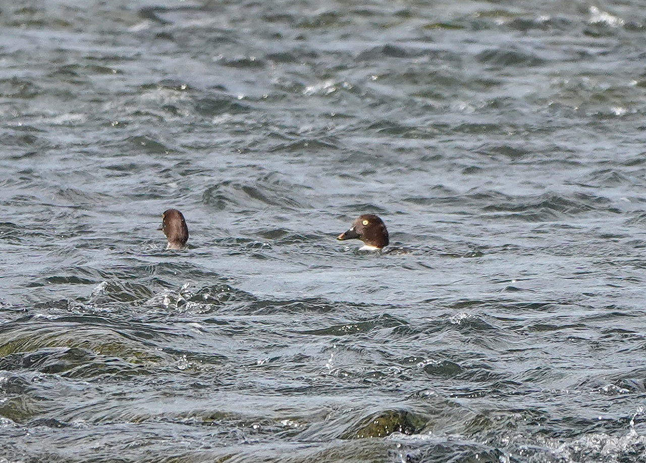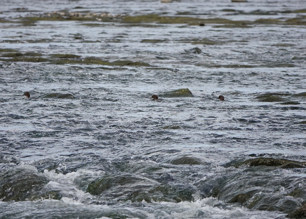 水際に下りてあてもなく見ていると、詳しい方がいて、あそこにいると教えてもらった。やっとわかったものの、かなり遠くで頭を出しているだけですぐに完全に潜ってしまい、再び頭を出してもまた、すぐ姿を消す。水面上に7~8割姿を見せてプカプカ浮かんでいるほかのカモたちとは大違い。よくこんなのが識別できるものだと感心することしきり。
