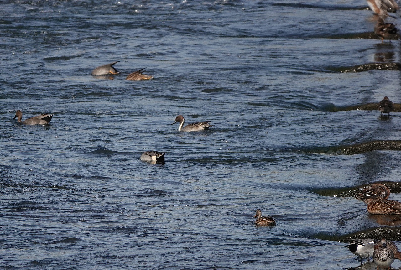 ↓ オナガガモもみつけた。中央で泳いでいる。ヒドリガモとならんできわめて普通にみられる