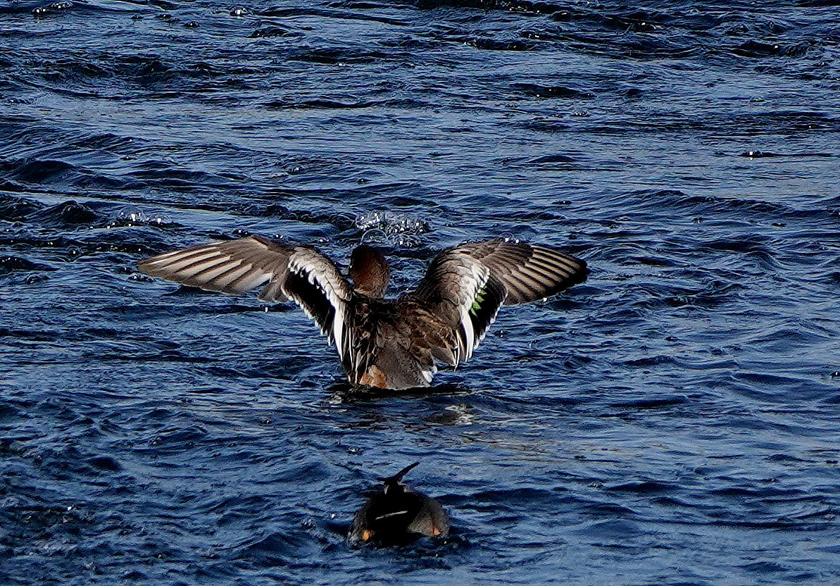 おっ、これはヒドリガモだ! と後ろ姿の翼鏡(右側に見えている緑の部分)を見てわかるようになったので少しだけ詳しくなったのかもしれない。後ろから見ると目立って、渡りの際に仲間の識別に役立つといわれている。普段泳いでいたり陸で休憩しているときも折りたたまれて見えないので、飛ぶとき、伸びあがってバタバタさせた時しかその全貌をみることができない。
