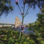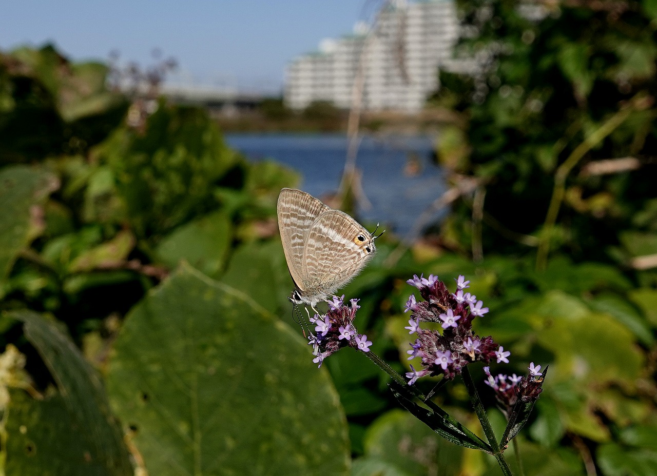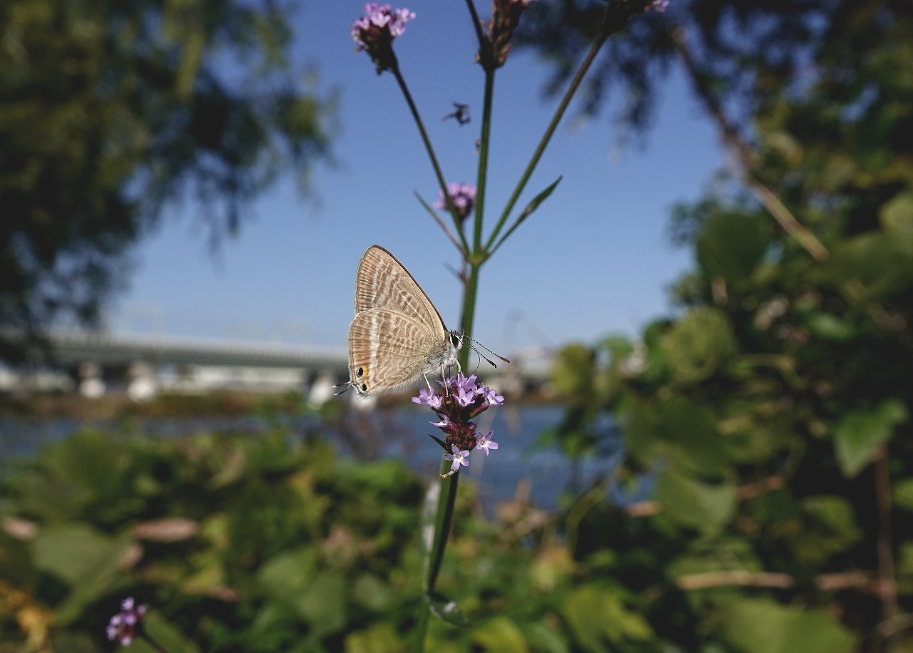 急にセセリたちが減った気がする。ウラナミシジミが紫のアレチハナガサで吸蜜しているがまだ比較的新鮮。こちらも個体数は減ってきた。気温が下がるというのは蝶たちには大きな打撃となるのだろう。多摩川、小田急の鉄橋を背景に。