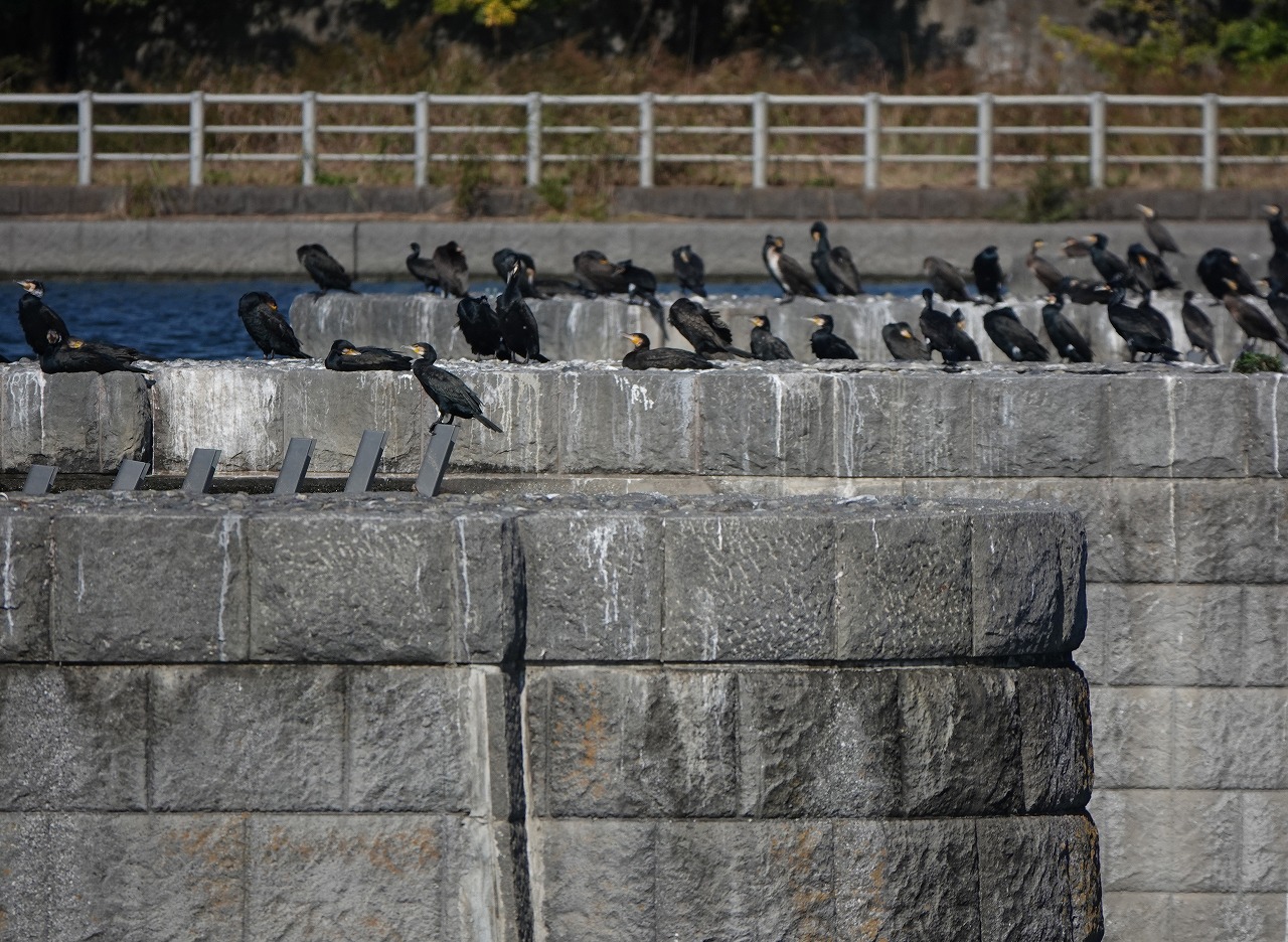 ↓ もう少し下流側に向かって歩いて宿河原堰に到着。鳥は圧倒的に増えていた。カワウがたくさん堰にとまっている。これは年中いる鳥だが、そろそろ冬鳥が増えてくる時期でこちらはこれから楽しめる時期が到来する