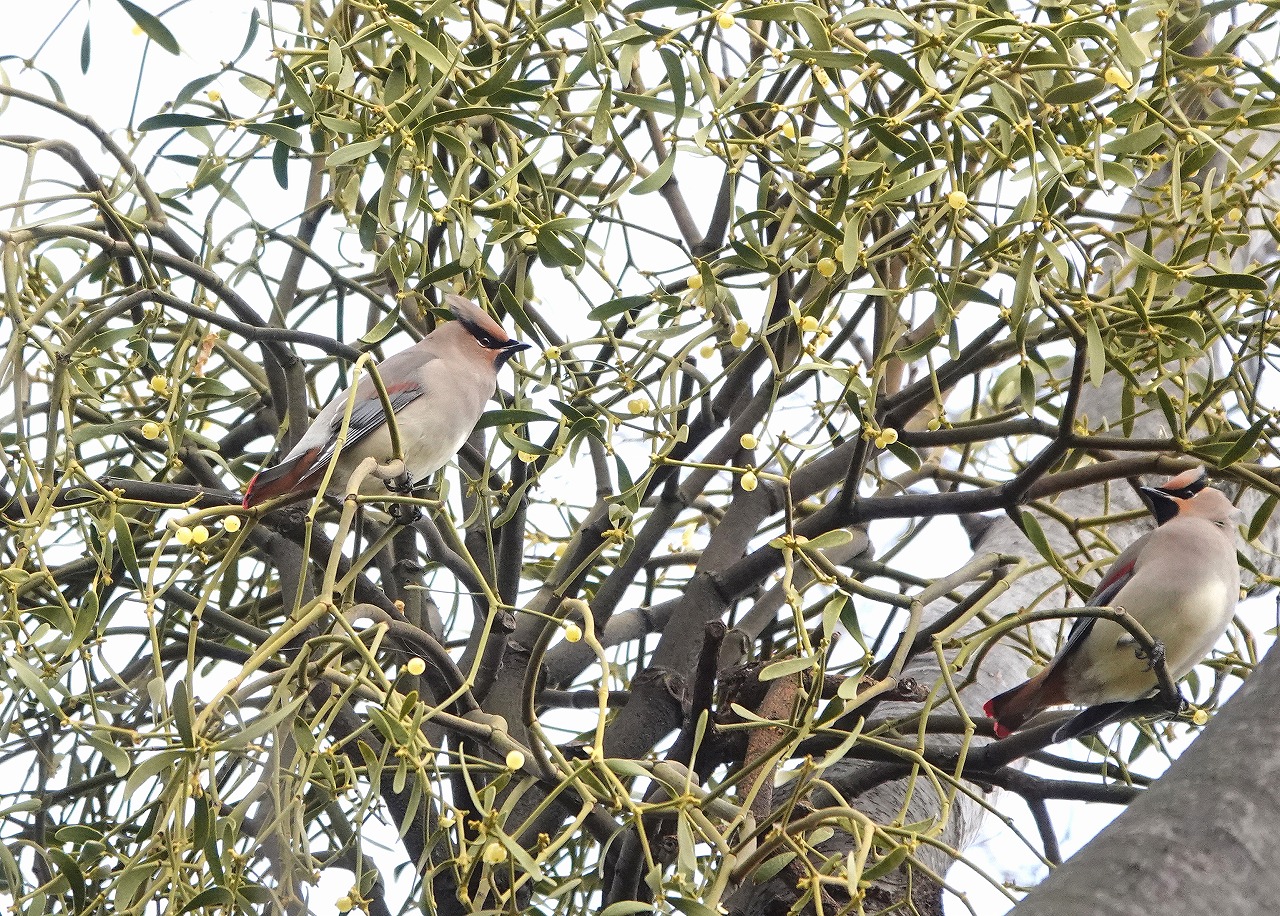 ヤドリギの実を求めて通常群で飛来するが、今のところせいぜい2~3羽。ヤドリギの生育状況偵察隊と思しき少数しか飛来しないがあとで群れが来るという保証はない。もとより、実をつけたヤドリギが少ない。いわゆる『鳥屋さん」と呼ばれるカメラマンたち(私もその端の端の端っくれかもしれない)がヒレンジャクの少なさを嘆く以上に、鳥の方はヤドリギの不作を嘆いているだろう。なにせ死活問題だ。さて、トップの画像、ヒレンジャクといえばこのシーンに遭遇するとが極めて多い。この時間は枝上でじっと動かずまじめな顔つき(?)であるのはなんとなく滑稽。