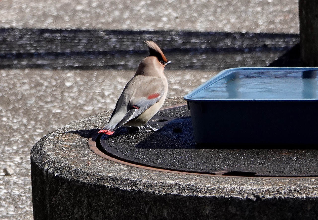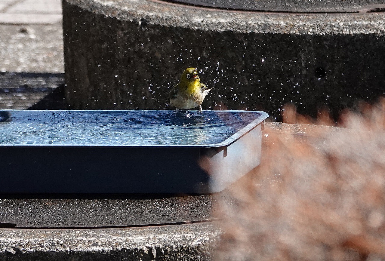 ↓ 広場の水盤に来るらしい。でもこいつはお呼びでない、申し訳ないけど・・・メジロ