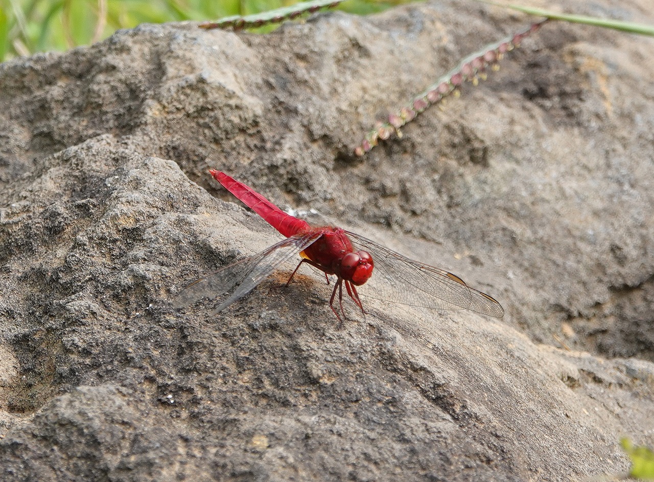 ピリカラのトウガラシくらい赤いアカトンボのオス。テリトリーを張って、盛んにパトロールした末にメスと邂逅、池で連結飛翔の産卵に至った。