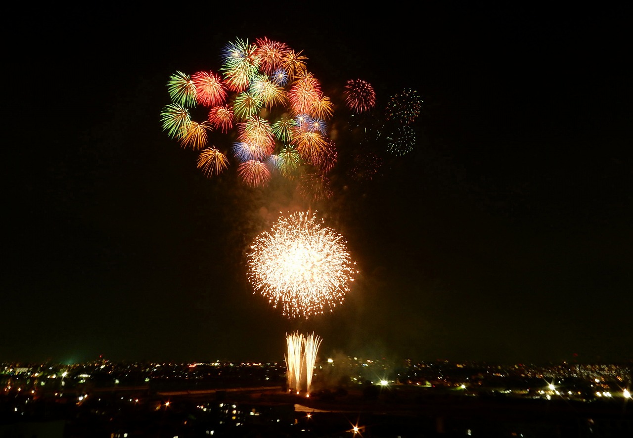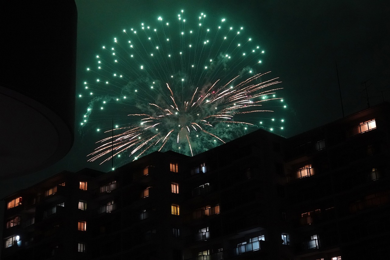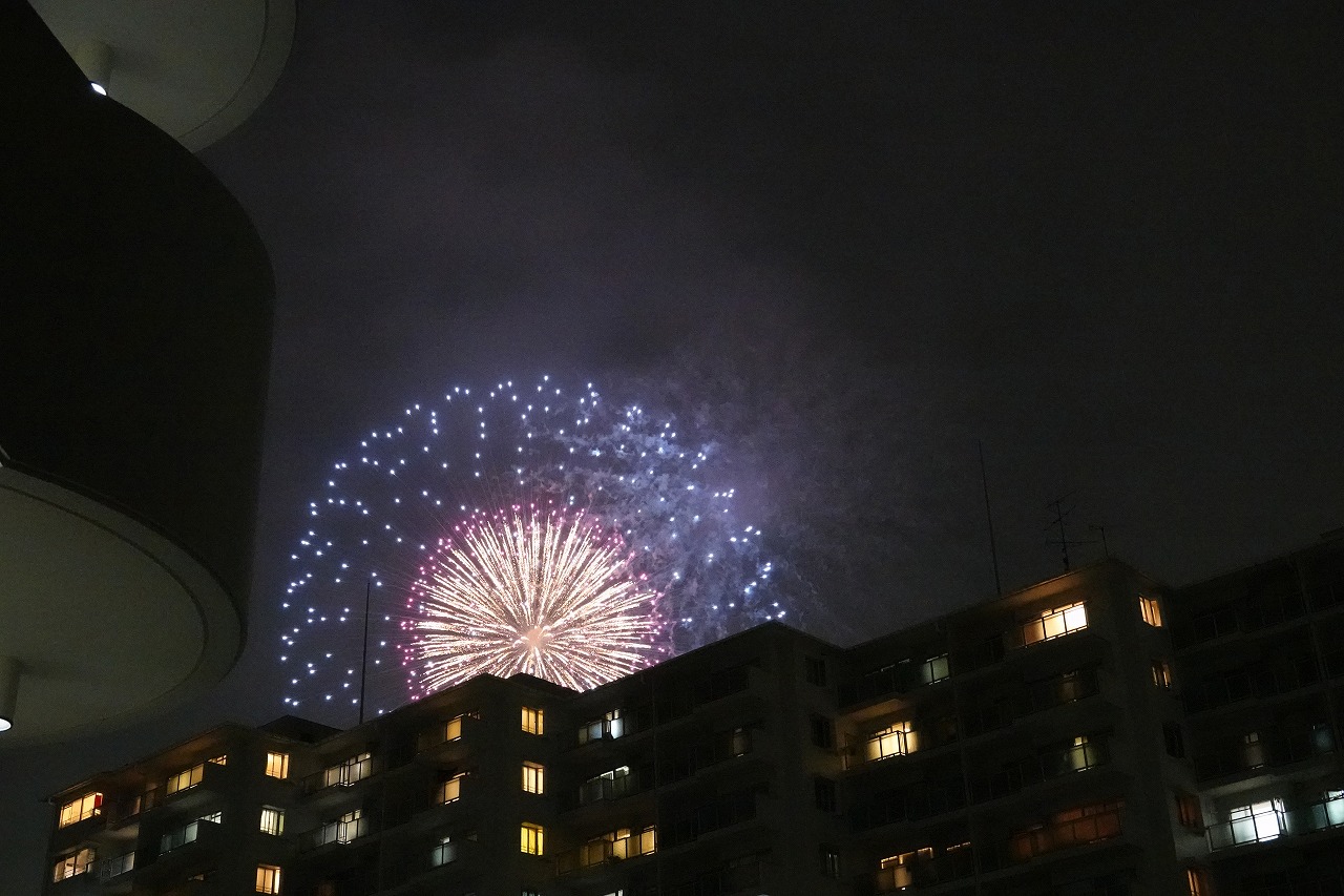↓ ついでに前夜自宅バルコニーからの花火。向かいの棟が視界を遮るので尺玉クラスしかよく見えない。そもそも花火に対する情熱はなくなって無常観が先立ってしまうのだが、音がするからまあ、ちょっと見るかくらいの気分にこのところ落ち着いた。以前は友人を招いて向かいの棟の知合いに玄関を開けて貰い上層階の階段室から全貌を見て悦に入った後に呑会を開催していたこともあった。今や無精になってこれで充分