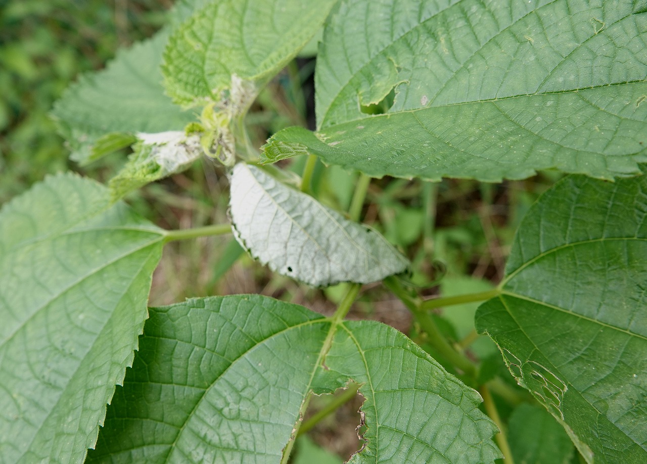 ↓ 経路中。カラムシ葉を餃子のように巻いているアカタテハの幼虫。開くと中に幼虫がいるのだがそっとしておいてやろう
