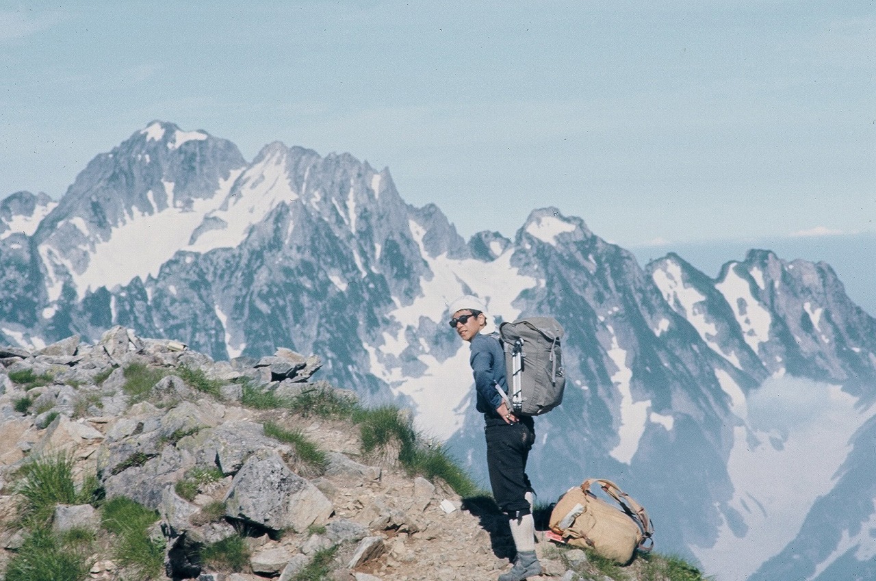 ↓ 鹿島槍ヶ岳の頂上の吊尾根より、黒部渓谷を挟んで聳える剱岳を望む。鹿島槍ヶ岳は双耳峰(頂上が二つある)で距離500mほどの稜線、吊尾根が両ピークを結んでいる。服装が時代がかっている・・・