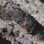 朽ちかけた桜の老木の洞(うろ)廻りに小さな青緑のハチが飛び回ってるのを相棒が見つけた。咋夏に共にフィーバーした寄生蜂のミドリセイボウに感じが似ている。ただこいつはほとんどじっとしておらず常に素速く動き回ってはすぐ飛立つので極めて撮りにくい。名前が分からず帰宅後に検索してみると、やはり寄生蜂であったが、名前は「セナガアナバチ」といいゴキブリに寄生するという。当初「エメラルドゴキブリバチ」かと思っていたが相棒よりエメラルドの方は同じ「セナガアナバチ属」に属するが日本には分布せず熱帯に生息するとのこと。ゴキブリ??ということでさらに検索して判明したのは、このハチたちの驚くべき本能由来の方法でゴキブリを操りながら寄生するという生態であり、また、それを調べ上げた研究者の信じがたい熱意と技量であった。
