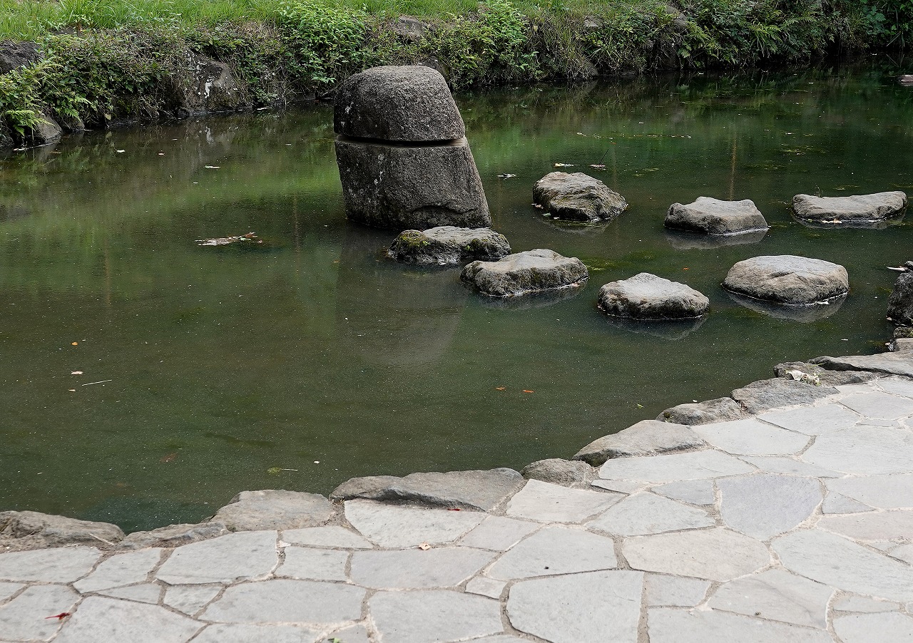 ↓ こんな小さな公園の池が舞台。メスとの産卵行動を終えたオス、またテリトリーを監視している。別のメス狙い? (画面左下の隅に小さく見える)