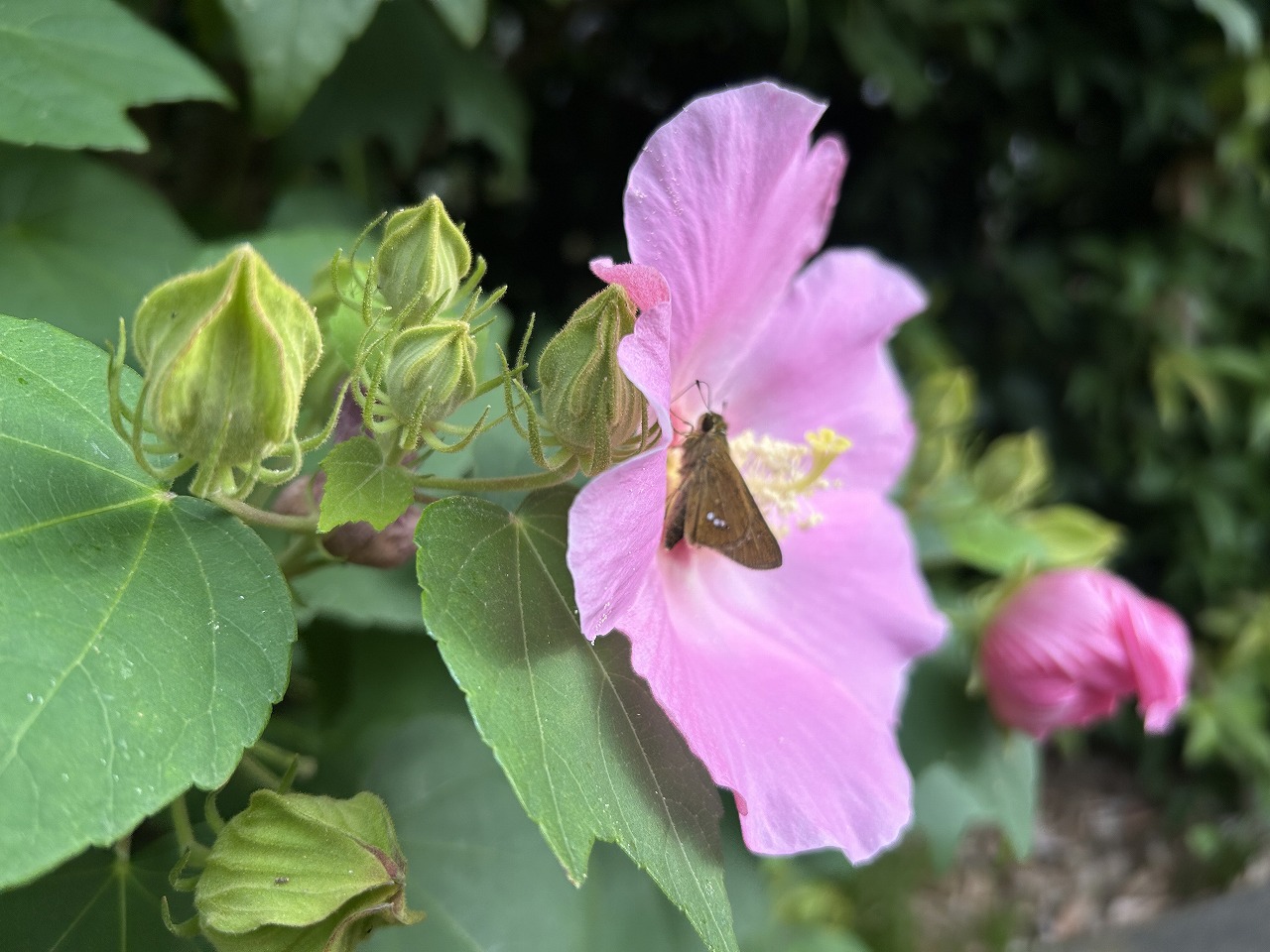 朝、ごみ捨ての途中に芙蓉が咲いているのでちょっと観察するとイチモンジセセリが懸命に(?)飛び回りながら吸蜜していたのでスマホで撮影。「花と蝶」の優雅なイメージとはちょっと異なり、胴太・翅小で飛翔は優雅さなくす速い。小学校の時にその幼虫がイネを食すので「害虫」と習った。モンシロチョウだって同じく幼虫がキャベツを食すので害虫。一方、先日紹介したセナガアナバチ、これはゴキブリに寄生してやっつけるので「益虫」とされているらしい、なんと一方的な決めつけ方か・・・食物連鎖の頂点に位置する(ほんとかな?必ずしもそうでないという説もあるらしい)人間目線ではあるが、食われる方の生物から見ると人間は害虫、いや害生物・天敵だろう。閑話休題、好き嫌いなくいろいろな花を訪れるイチモンジセセリを害虫だと思って見たことは中学生以降皆無ではある。