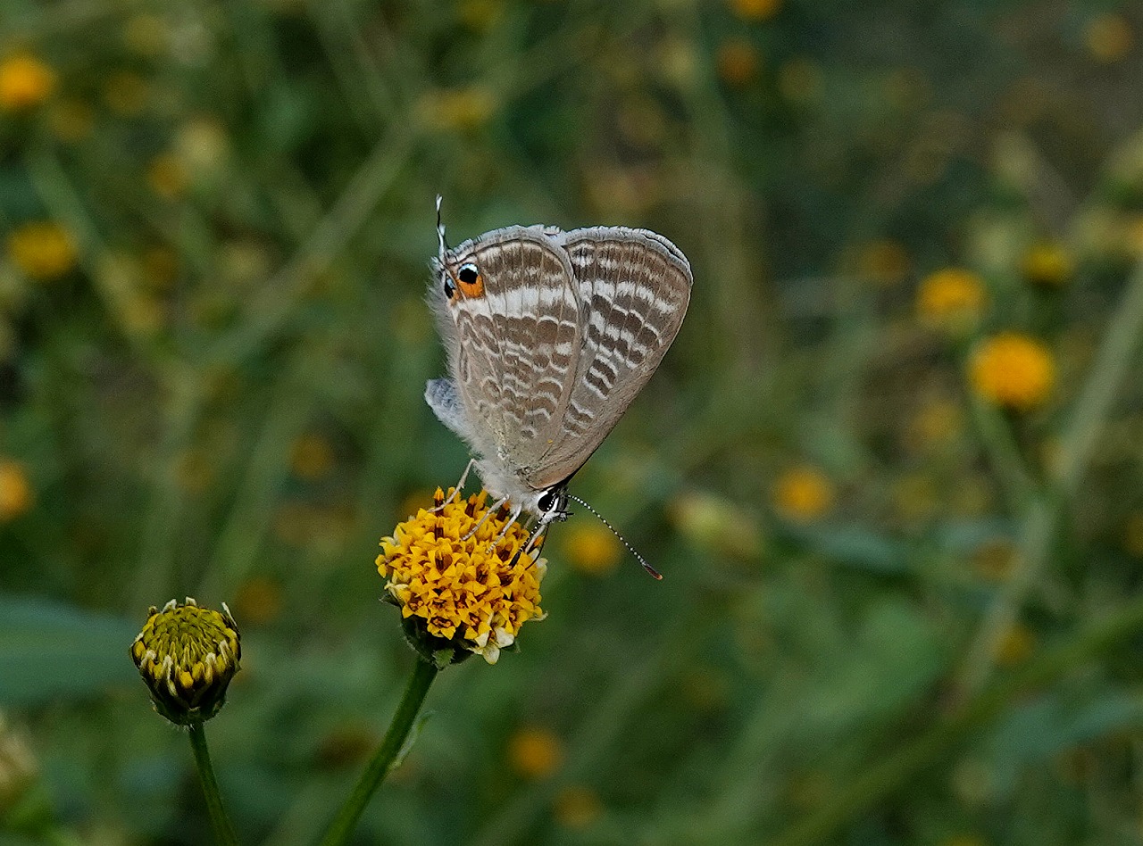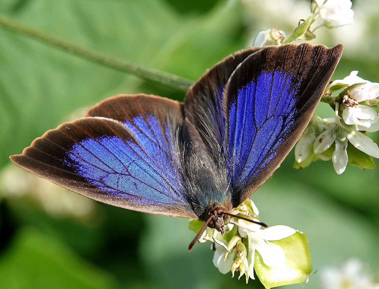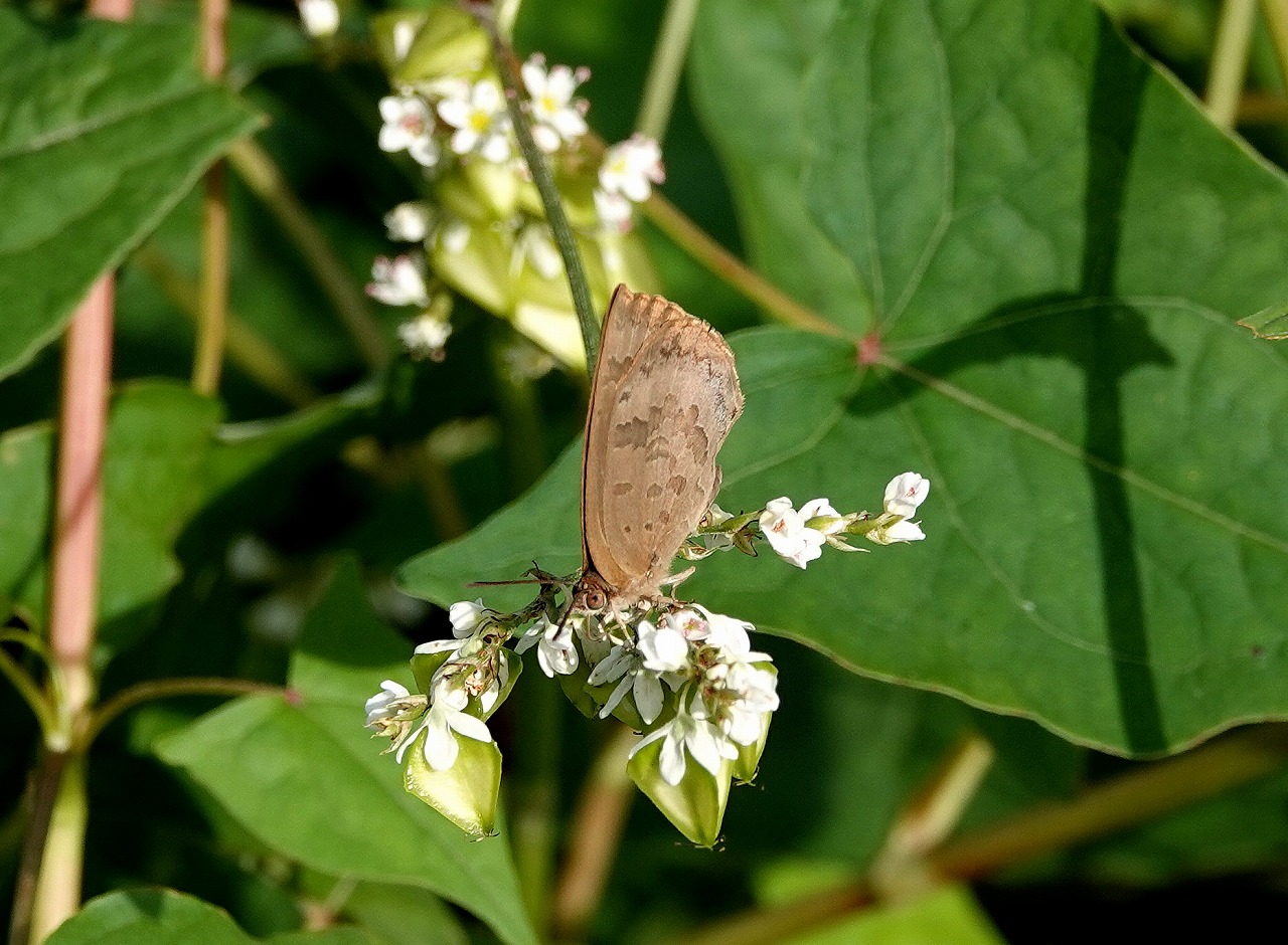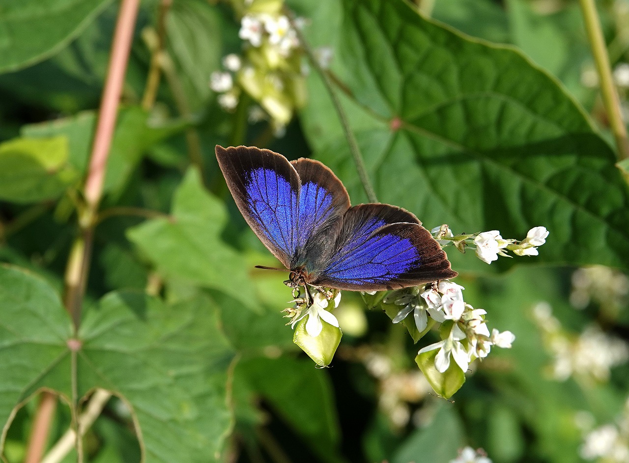 一度、朝早めにやってみたかったので9時ごろのスタートとしてみると、気温がまだ上がりきらず(21度)開始当初は数が少なかったが、時間の経過とともにあちこちで葉上で開翅しているシジミ、セセリ、タテハが見られた。トップはムラサキシジミ。これまで午後の調査では殆ど見たことがなかったが雲から太陽が顔を出すたびにそれと連動して開翅してくれた。いつ見ても美しい・・・シャクチリソバの白い花で吸蜜と言いたいところだが、結局、観察している間は一度も口吻をのばさず、単に花にとまっているだけだった。