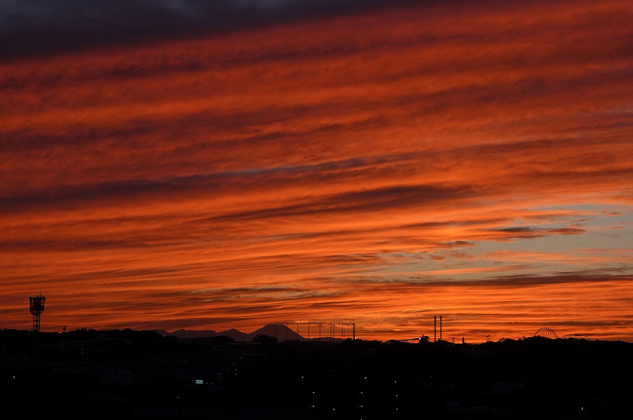 ↓ このごろきれいな夕焼けが多い。バルコニーより富士を望む。ゴルフをやらないので余計に腹立たしい練習場の檻