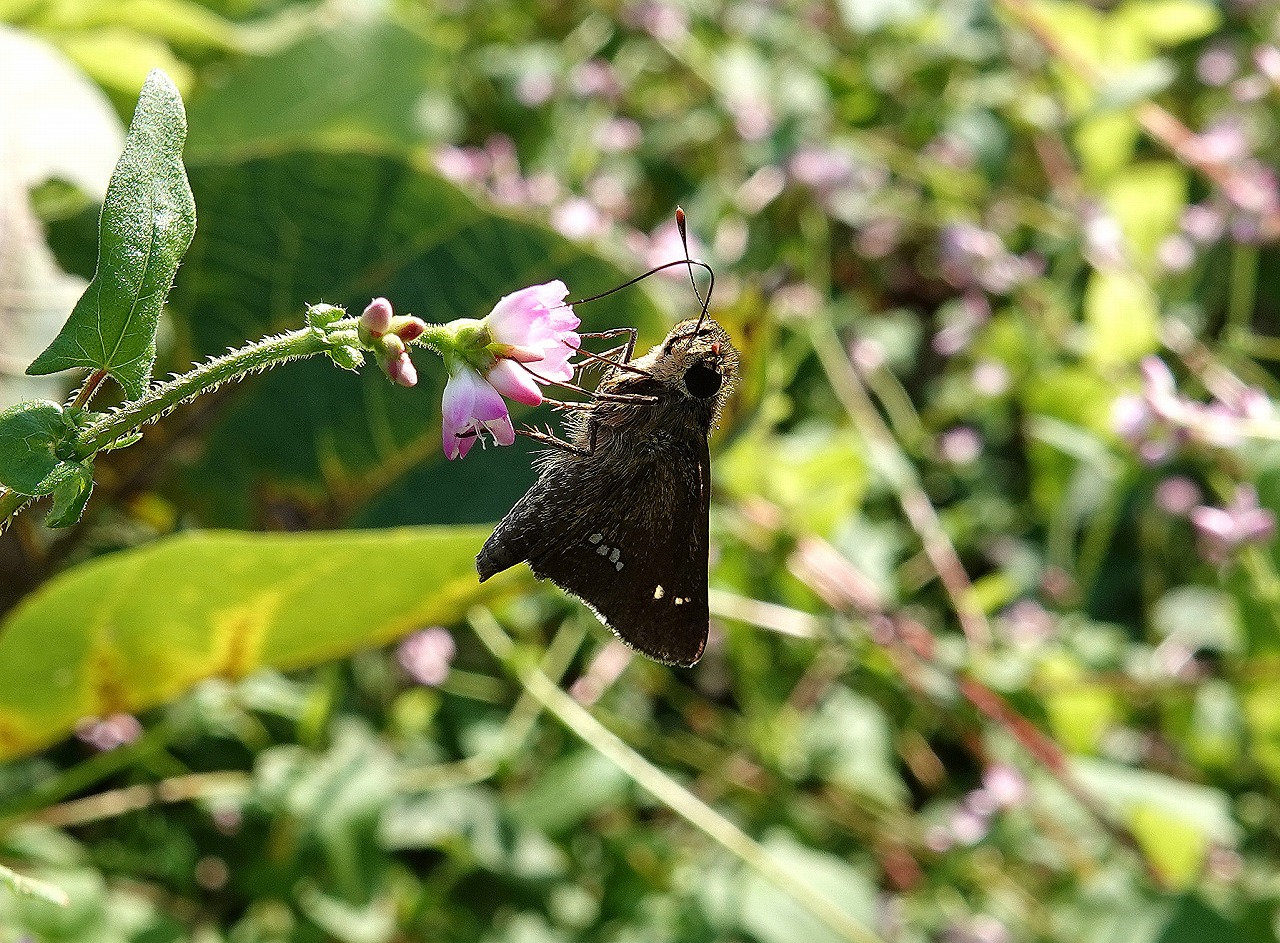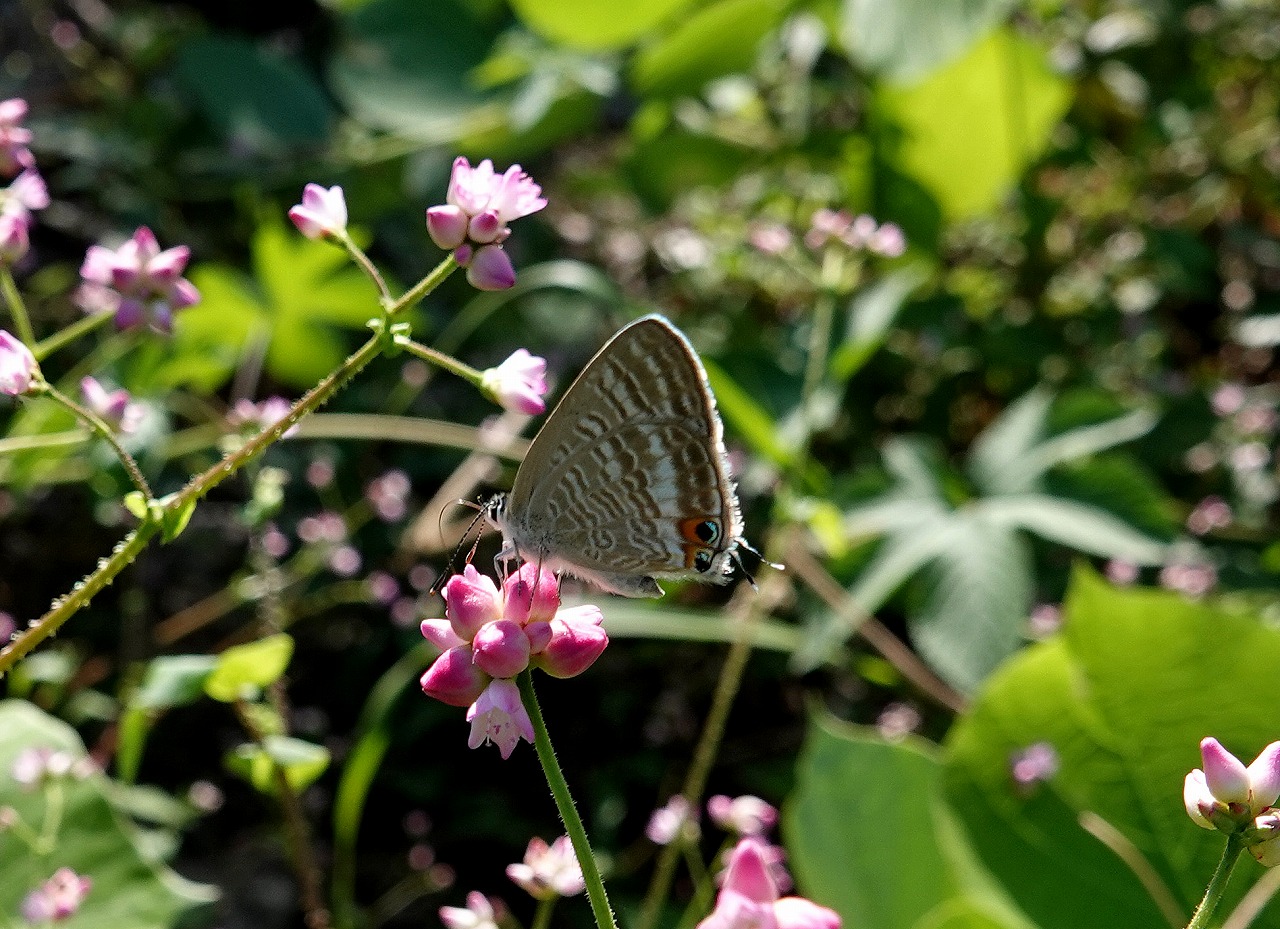 ↓ ウラナミシジミ。吸蜜しているピンクの可憐な花は「ママコノシリヌグイ」というとんでもない名前をつけられたタデの仲間の草花(茎にトゲトゲが見えるが実際に触ると刺さって痛い。憎き継子の尻はこれで拭いてやるということらしいがいったい誰が命名したのだろう?)