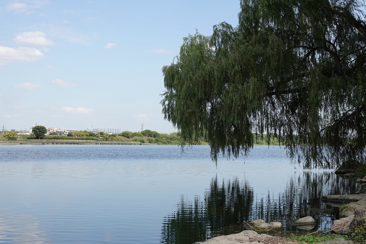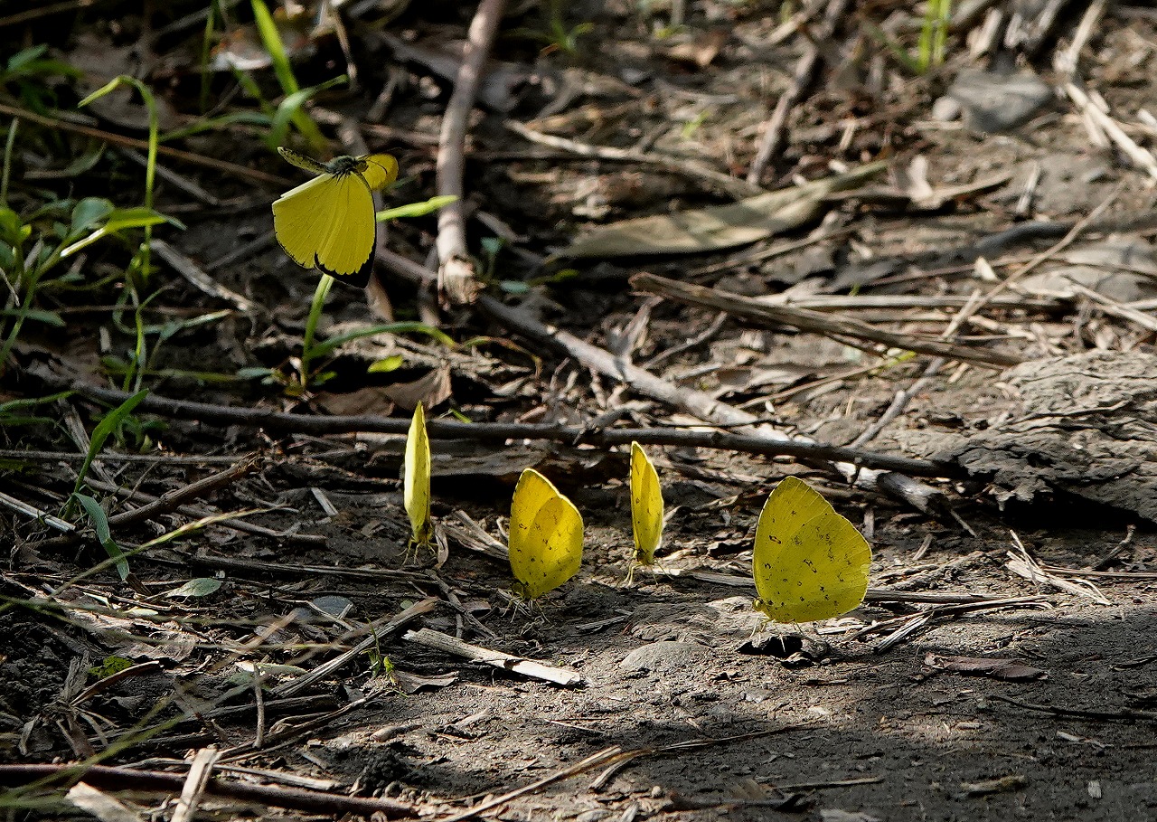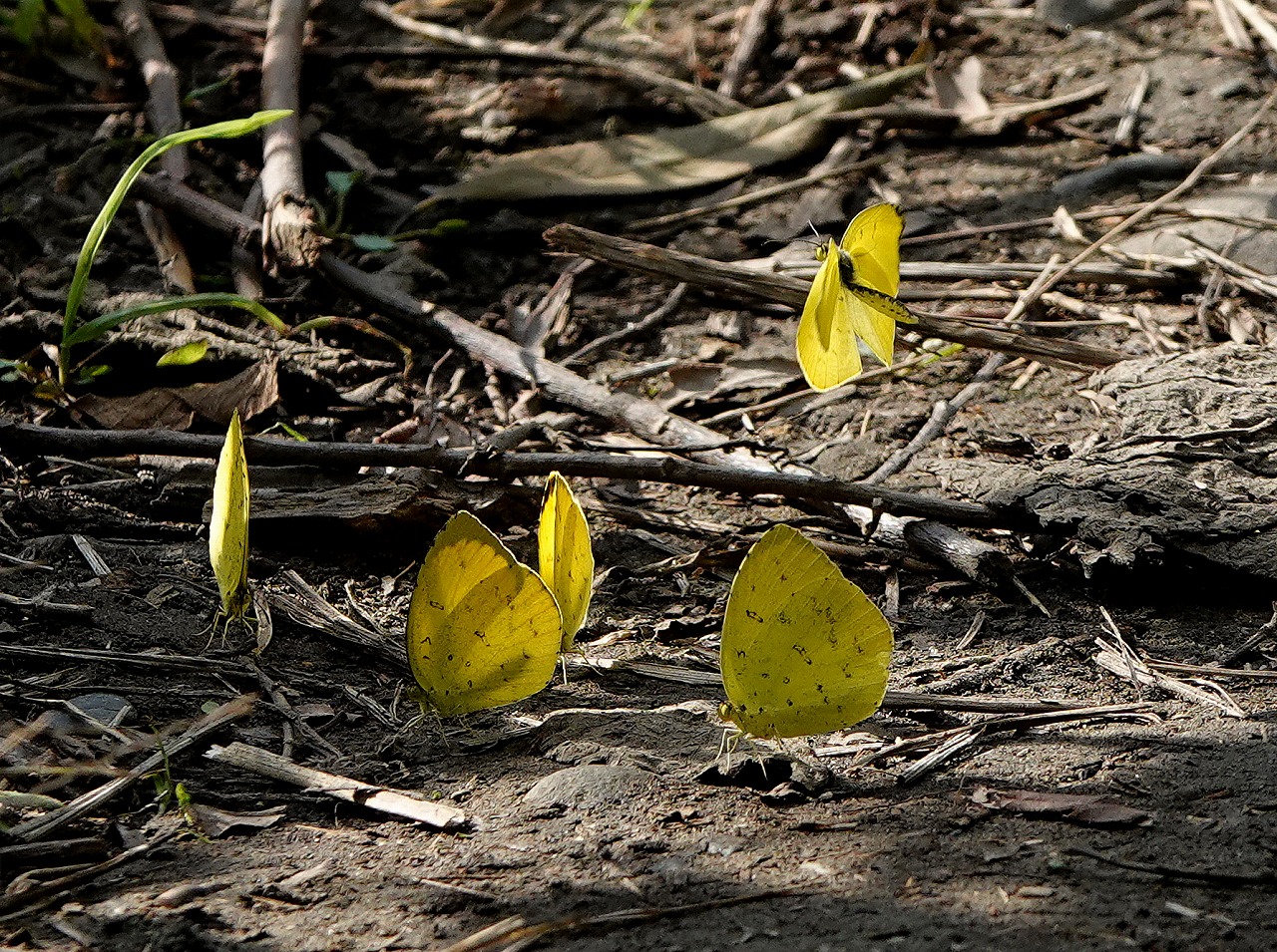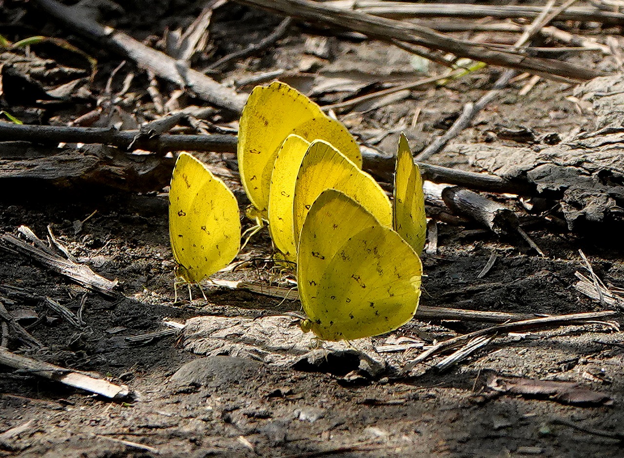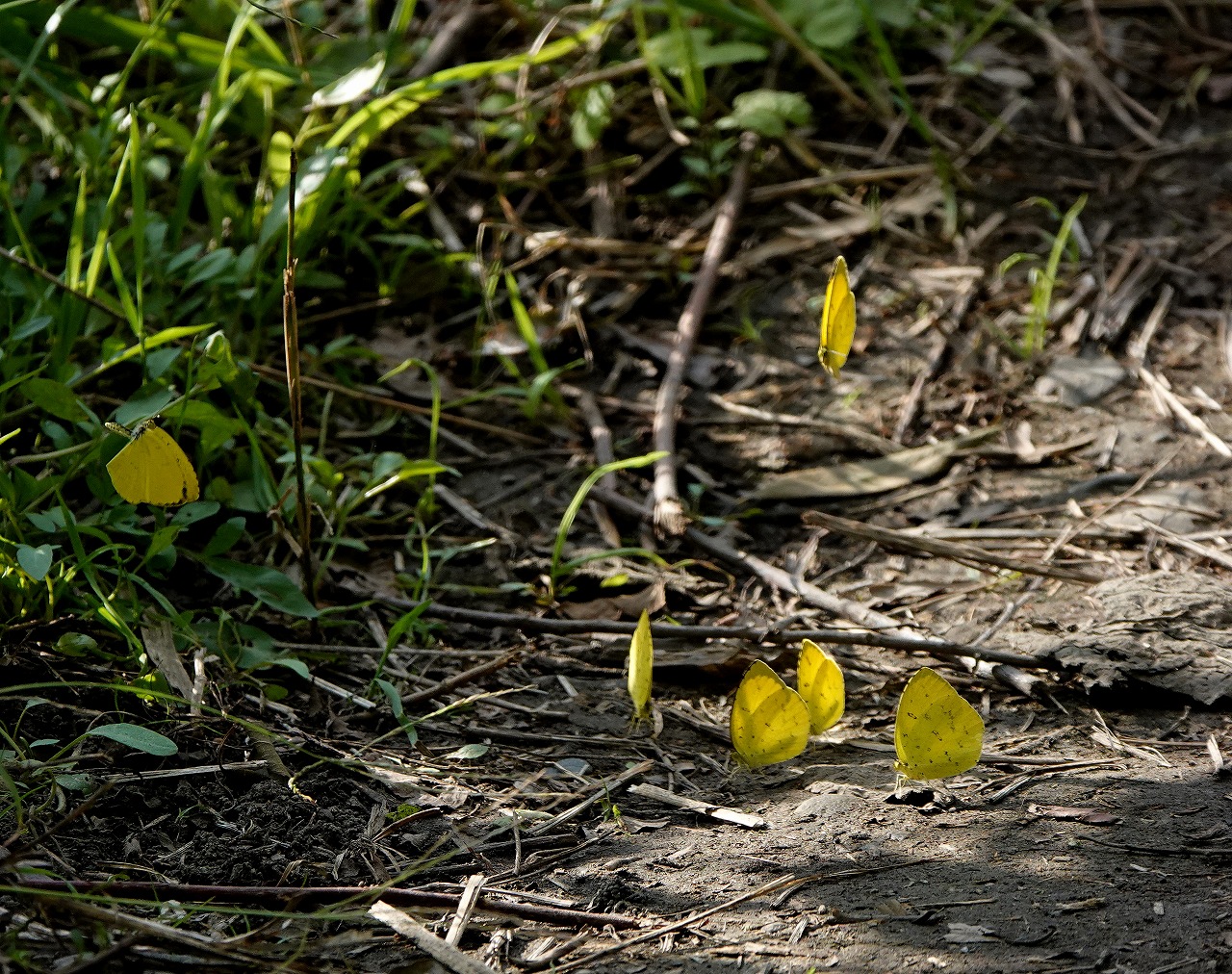 湾処とは本流と一部繋がっている池のことで、宿河原堰近くにあってのんびりと釣りを楽しむ人がよく見られる。本流と池の間の細い小径を歩いているとちょっと先の地面からキタキチョウが驚いたらしく一斉に紙吹雪のように飛び上がった。10頭以上はいたので惜しいことをした。また、吸水ポイントには戻ってくるだろうとしばらく距離を取って待っていると、思った通りぼつぼつと戻ってきたが結局、6頭までいったあとにまた解散してしまった。