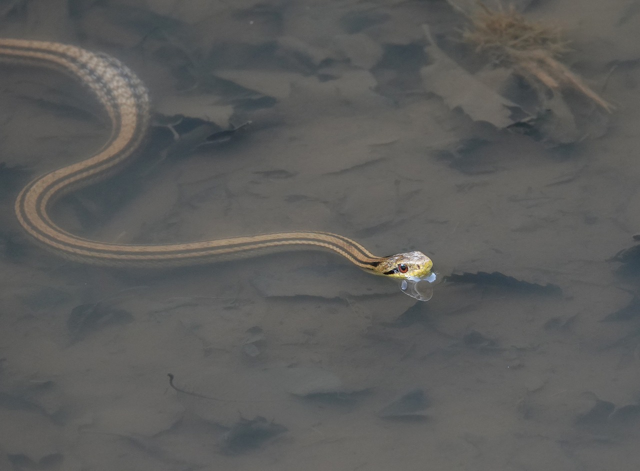 ↓ 水面を器用に身をくねらせて泳ぐシマヘビ (アーカイブ 2023年5月17日 生田緑地)
