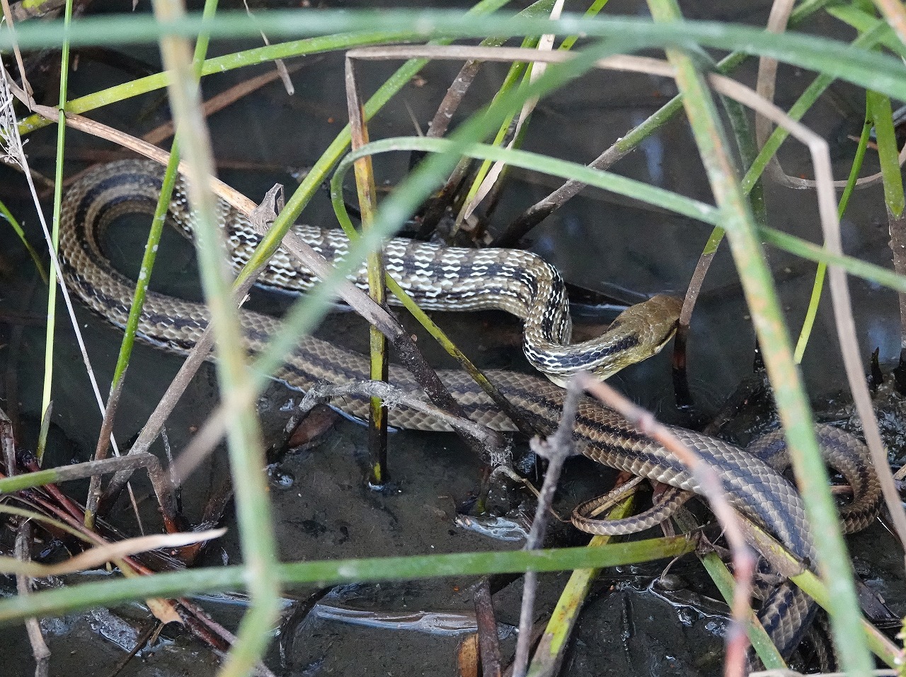 うん、鳥? けたたましい鳴き声がするのでそっと水際に近づいたが飛び立つ気配もなく声は続く。近寄ってわかったのは大きめのシマヘビが、これまたかなり大きめのカエル(食用ガエル?)を捕らえて締め付け、呑み込もうと格闘していた。鳴き声はカエルの断末魔ともいうべき悲鳴だったことが判明した。シマヘビは1メートルの距離でカメラを構えているのに取り込み中でこの大きな獲物に集中していた。それから15分余りで決着はつきシマヘビはヨシの藪の中に消えていった。食物連鎖からすると日常的なシーンなのであろうが目の前で見るのは初めてで衝撃的。ヘビの下あごは特別構造で、グルリとはつながっておらず左右に分かれていてその間隔も広がり、そのうえ、上下のあご角度は160度くらいまで開くので口よりかなり大きい獲物でも丸呑みが可能なのだという。カワセミが大きめの魚を丸呑みする光景はなんとなくユーモラスですらあるが、これはあまりに生々しく一連の経過の画像、動画も撮るには撮ったがアップは差し控えることにした。