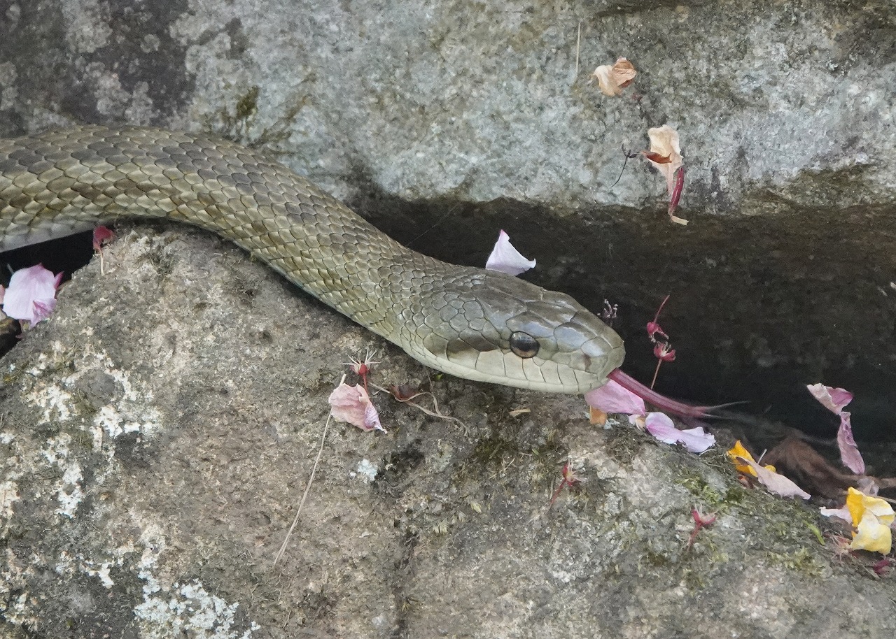 ↓ 多摩川、二カ領用水でときおり見かけるアオダイショウ。冬眠明けの二枚舌 (アーカイブ 2021年4月4日 二カ領用水)