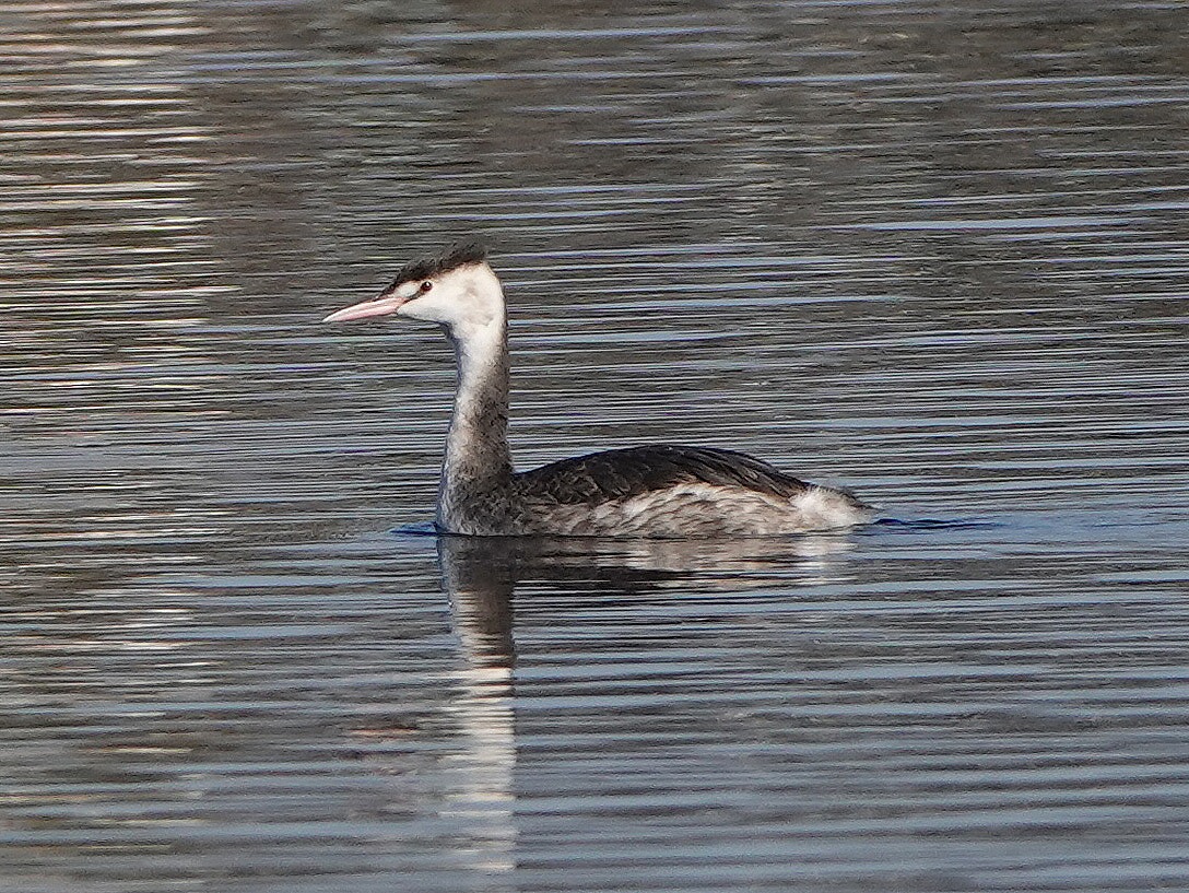 ↓ こちらはカンムリカイツブリ。カイツブリほどではないがやはり潜水の名手。かなり遠かった・・・