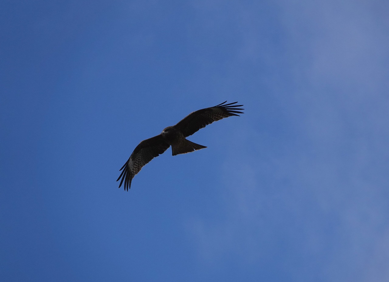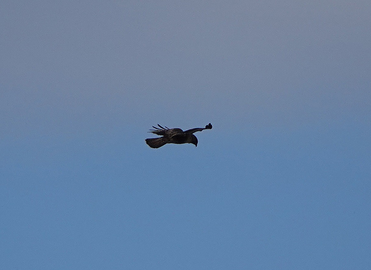 ↓ 諦めて駅方向に戻るとはるか上空にチョウゲンボウと思しき鳥影、ホバリングしてるのでそうかな?とは思うもののノスリもホバるらしい。ただ小型なのとこれまでの感覚からチョウゲンボウと信じたかったが、形がちょっとちがうかな?? 上空から降りずにそのまま飛び去った・・・