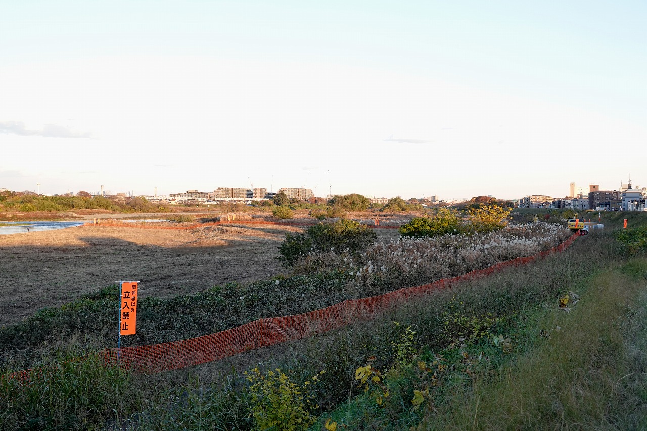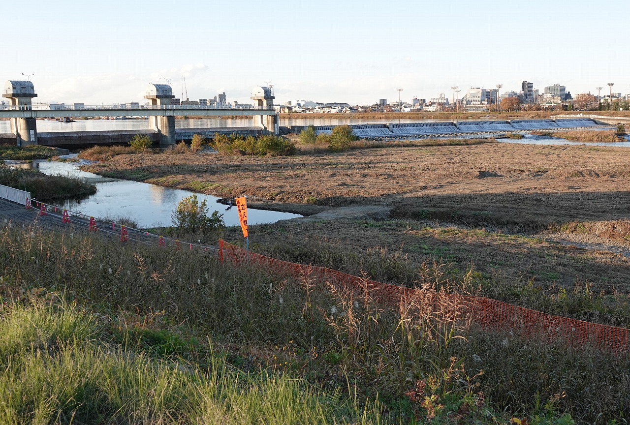想像以上に広い範囲で土砂の浚渫・・・とは違う、このあたりが水に埋まるのは年に一度あるかないか、2019年のように土手近くまで上がったことはあったが(台風19号)普通は低木まじりの草地。ここの向かい側では毎年、調布の花火大会をやっている。表層の植物を根こそぎにしているので生態系にはまさに壊滅的打撃を与えるだろう。人間の「いのちとくらしをまもる」のだろうがこれだけの規模でやる必然性があるのか、どんな計算で決めてるか見当もつかない。上流の聖蹟桜ヶ丘には野鳥のパラダイスのようなところがあった「らしい」。一昨年、過去の情報で行ってみると大規模な護岸工事が何年も続いていて、鳥など広範囲で影もなかった。まあ、カラス多数と水鳥少々、ジョウビタキを一羽見たくらい。