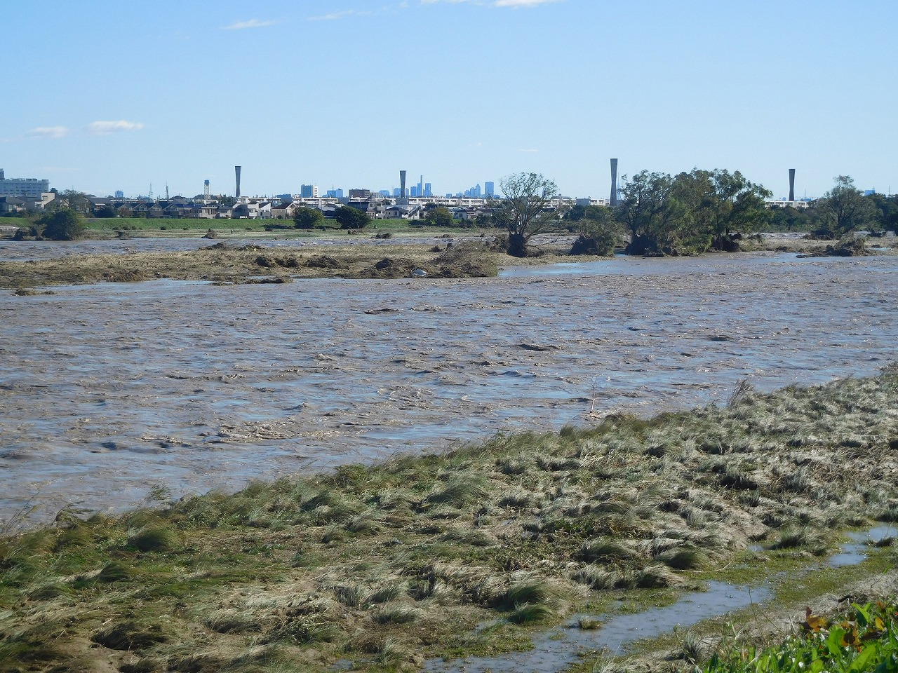 ↓ これはもう5年以上前 (アーカイブ 2019年10月13日 台風19号一過 中野島 隣の稲田堤の建築中の現場まで歩いて確認に行った時の写真。南武線はストップ)