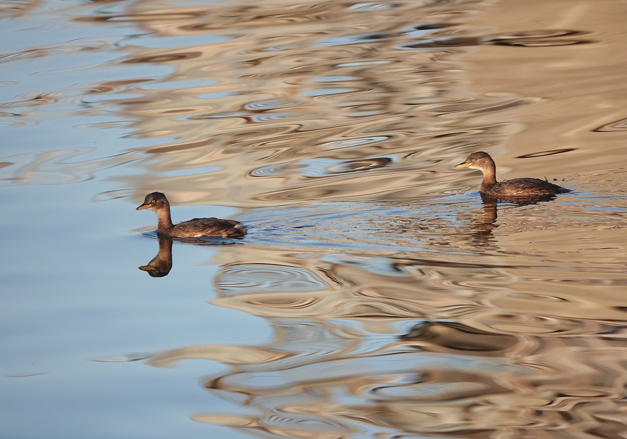 ↓ あまり殺風景なので、堰の上流側に回って見つけた番(つがい)のカイツブリに気持ちが和んだ
