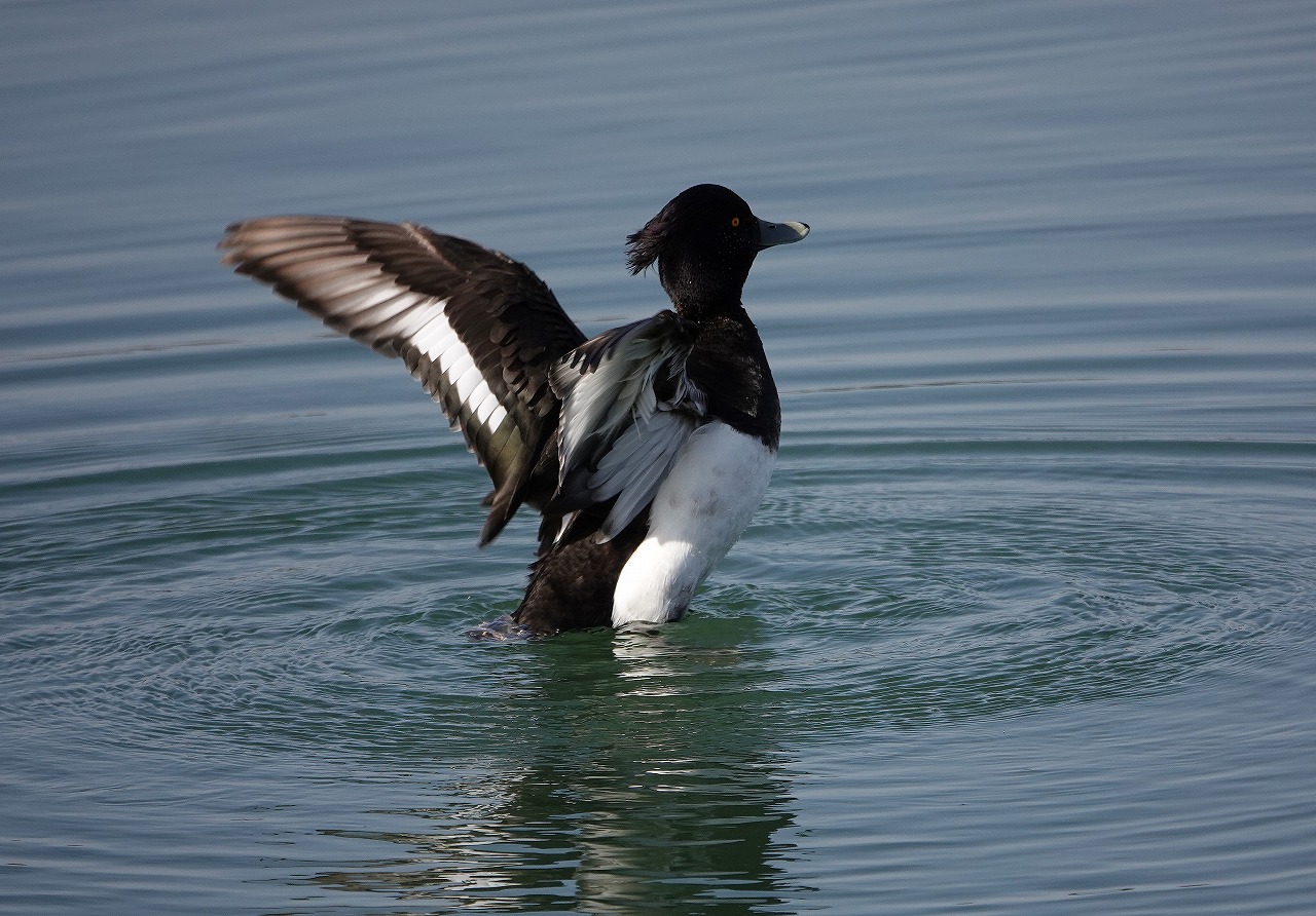キンクロハジロが羽繕いの後、水面から伸びあがってパタパタしている。一種のストレッチか?