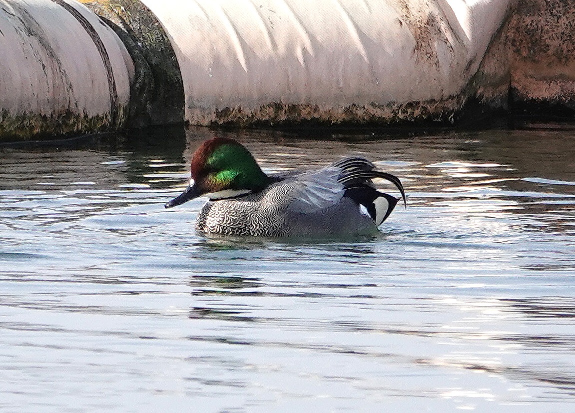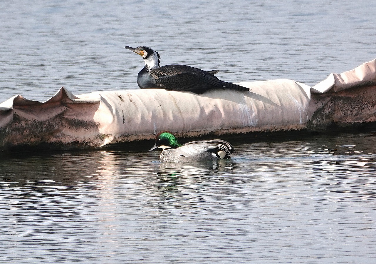 ↓ カワウの手前に、裏の多摩川では稀にしか見かけないヨシガモがいた。頭と尾周辺が独特の形状・色・模様