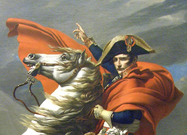 ↓ ヨシガモの頭部はよくナポレオンハットと称される。角が2か所ある二角帽子(Bicorne ビコルヌ)でナポレオン時代の将軍、将校たちが着用していた。1800年のイタリア遠征時にアルプス越えをするナポレオン(プロパガンダ的に宮廷画家ダヴィッド(David)が描いた英雄画。部分)。20年前にウイーンのベルデヴェデーレ宮殿で実物(といっても5点がフランス、及び周辺国に散在している)を見たことがある (⇒画像 Wikipedia)