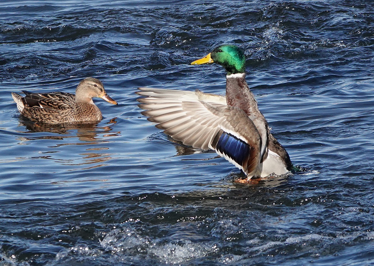 ↓ 近くでマガモのオスがメスと向かい合ってパタパタしていた。翼鏡(青い部分)はコガモとはずいぶん違う