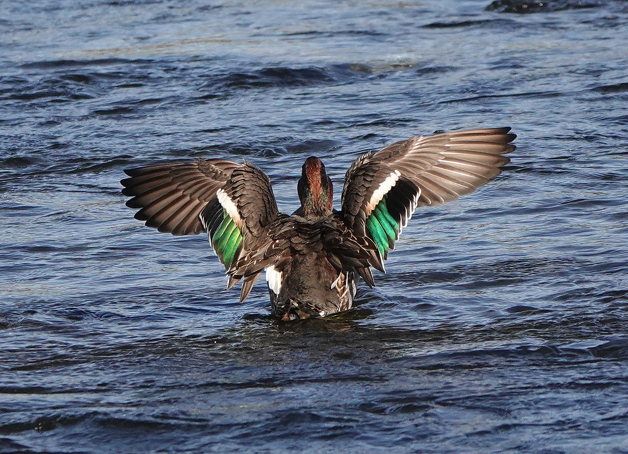 この翼鏡(緑の部分)の構造色の輝きは強烈で水面にも反射している。普段なかなか全面的には見せてくれずチラ見せが多い。