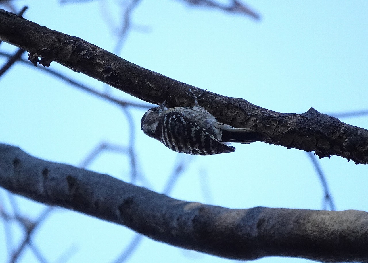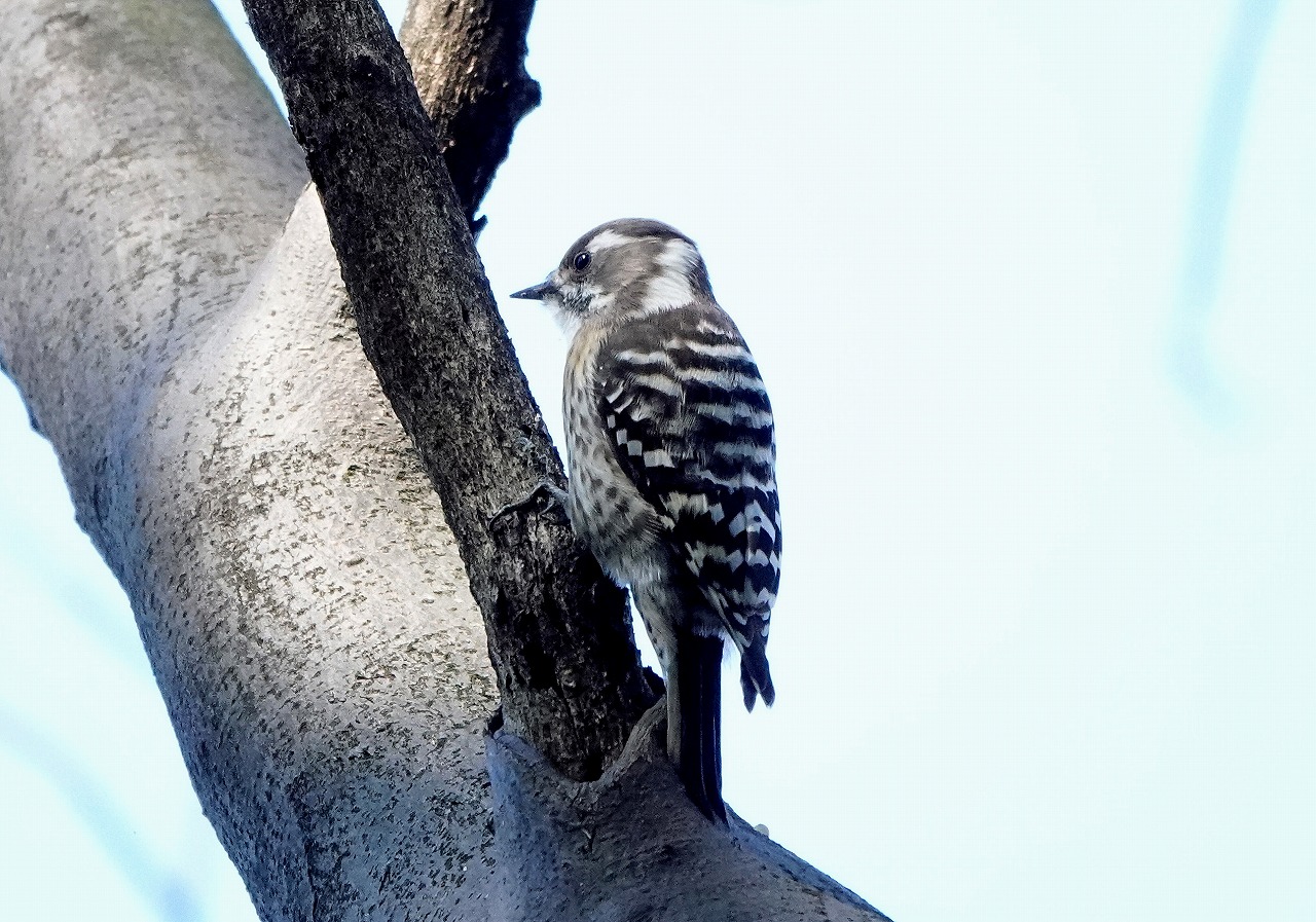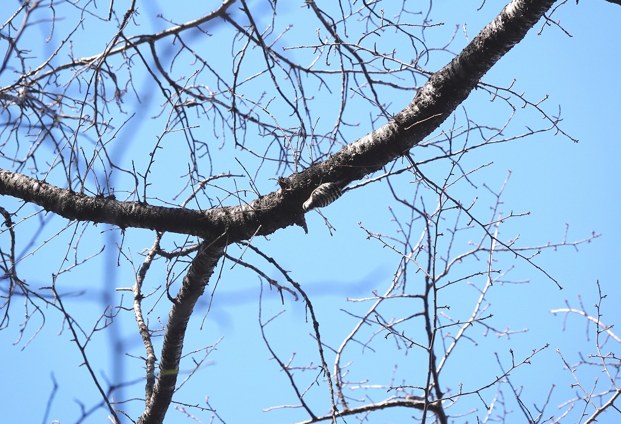 生田緑地は秋にツリフネソウに飛来・吸蜜するホシホウジャクを撮影して以来だ。冬枯れの殺風景な雰囲気のなかで、コツコツ木をたたく音が響いていたが予想通りコゲラだった。この緑地ではキツツキ類としてはこのコゲラと緑色のアオゲラしか見たことがない。こんなに響き渡るほどの音で木をつついていて脳震盪を起こさないというのは不思議だがいろいろと研究されてきたらしい。以下はWIKIPEDIAの記載: