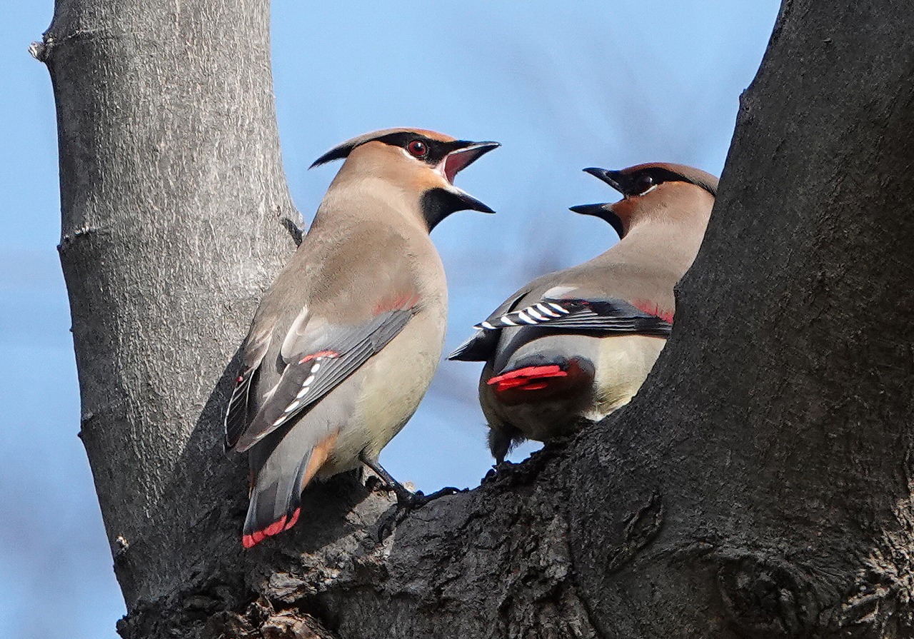 ↓ ヒレンジャク 原因は2羽の間の木の俣のところに雨水が溜まっていて、この水場をめぐる争い (アーカイブ 2024年2月20日川崎市内)