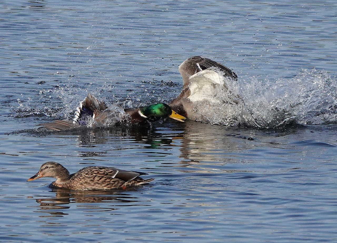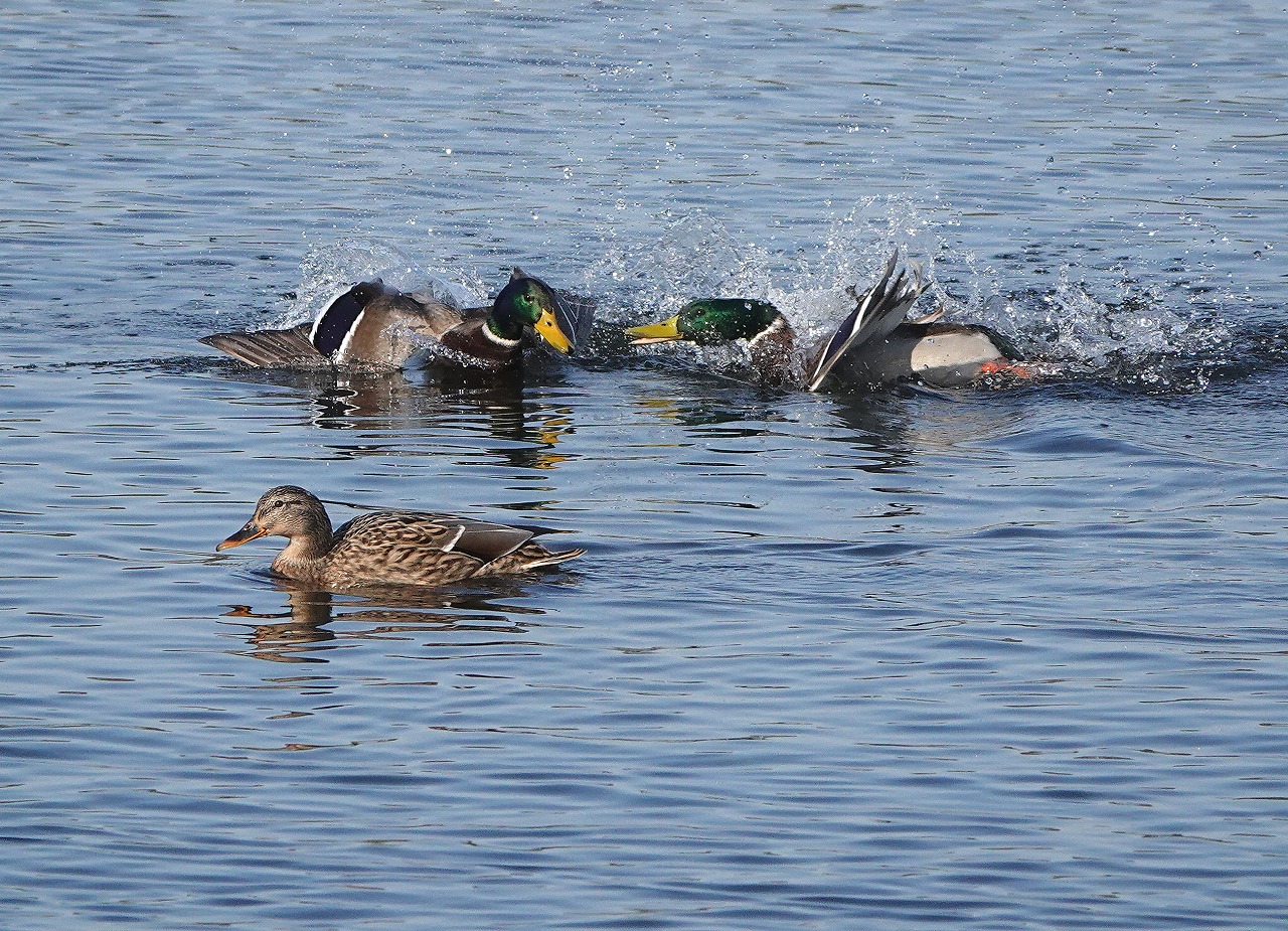 多摩川の宿河原堰。マガモのオス二羽が激しく争っていた。因みに手前で他人顔してるのはメス。マガモは一夫多妻制のようであるが、そのイメージとは結び付かない。モテメス?
