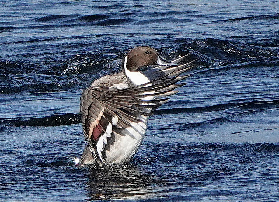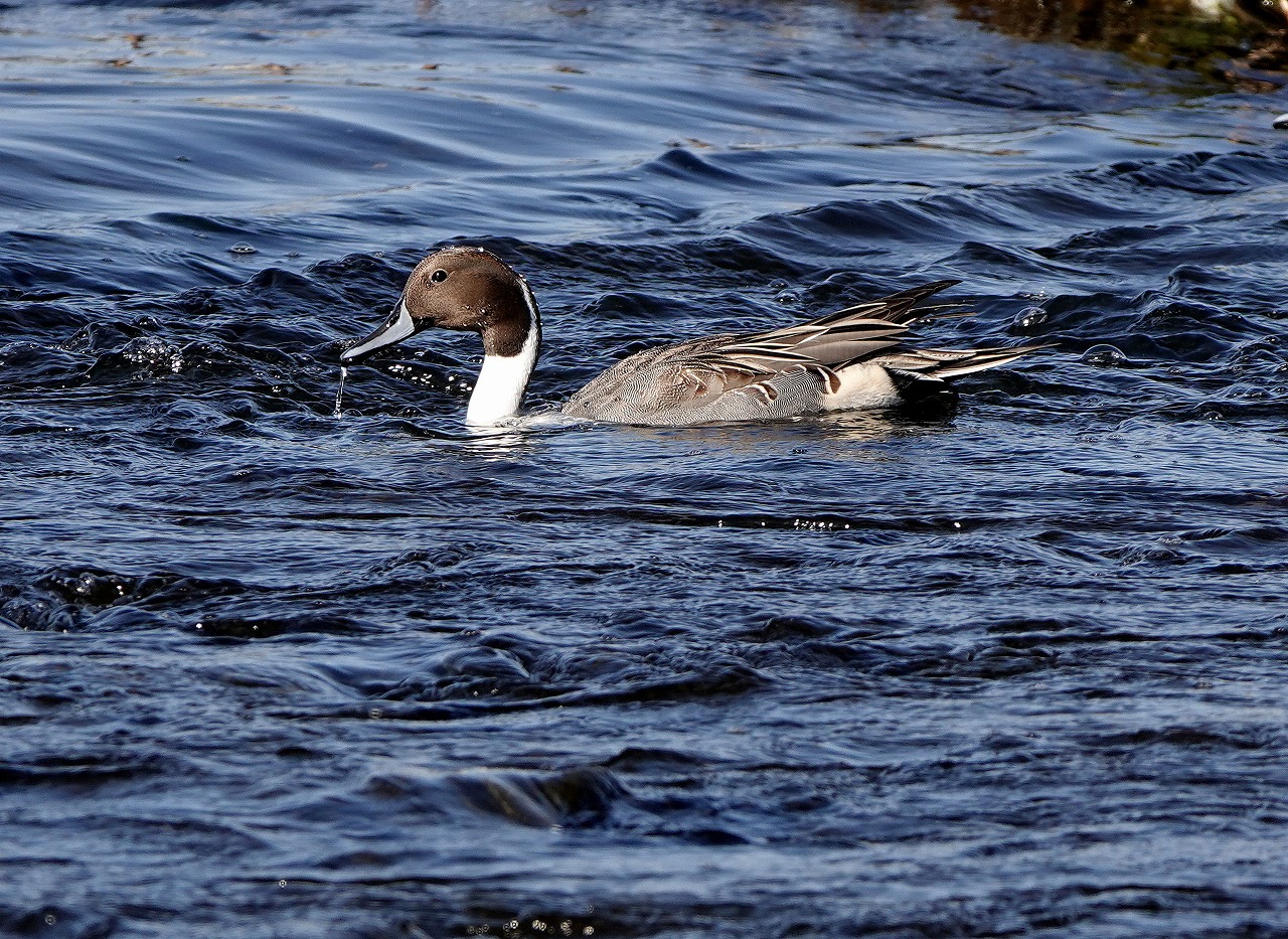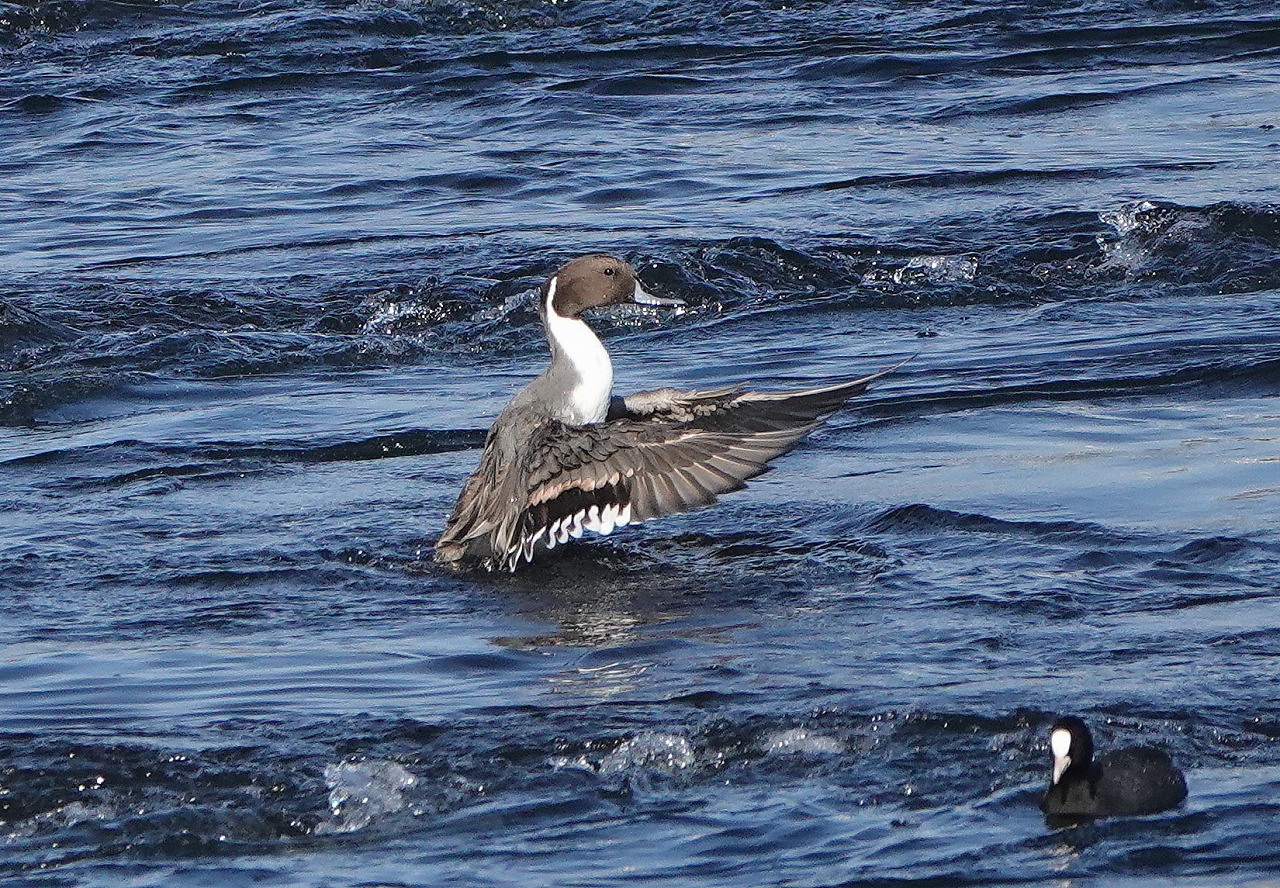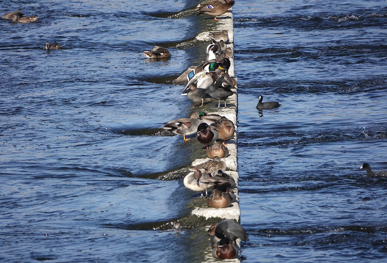 ↓ 動物園みたいにたくさんいるが手前から4羽目くらいにオナガガモがいる(羽繕いしている)