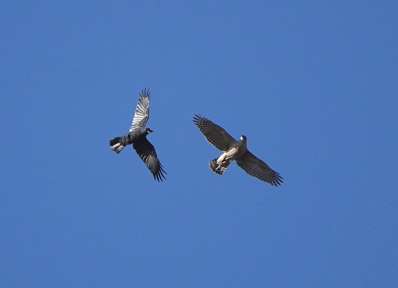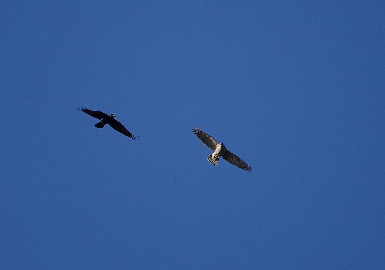 執拗にカラスが猛禽を追尾している。猛禽はカラスに比べて小さく幼鳥と見られる。今回、幼鳥とはいえカラスは集団でなくただの一羽。カラスが天敵の猛禽を追いかけ威嚇するのは巣やヒナを守るため(人間をも襲う)らしいが、延々と追尾して、猛禽は幼鳥でもありひたすら逃げまわるだけで可哀そうになってくる。チョウゲンボウかと思ったがどうやら、オオタカの幼鳥のようだ(間違ってたらごめんなさい)。