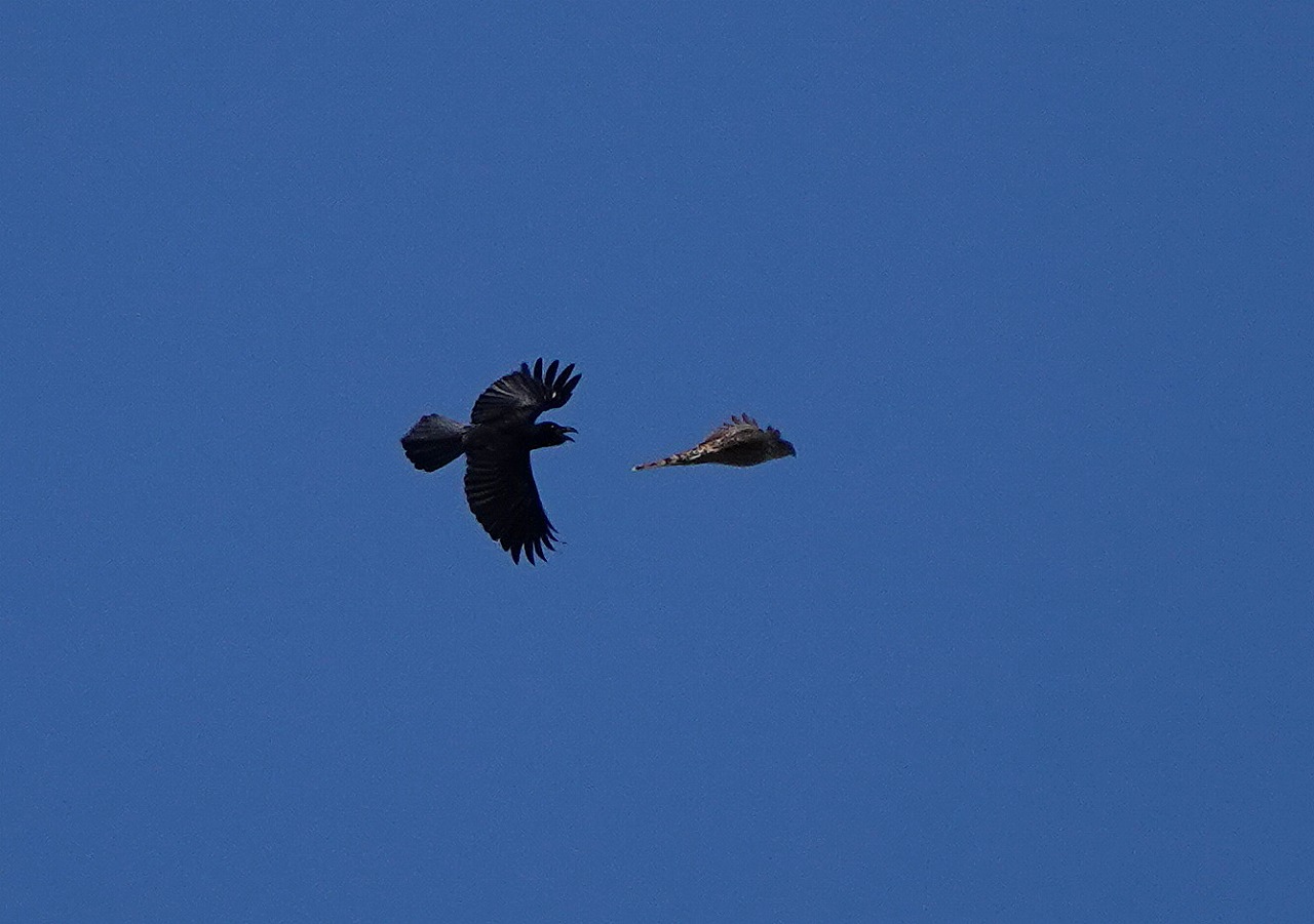 裏の多摩川ではしばしば、集団で猛禽を追尾しいやがらせをするカラスを見かけるのですが・・・