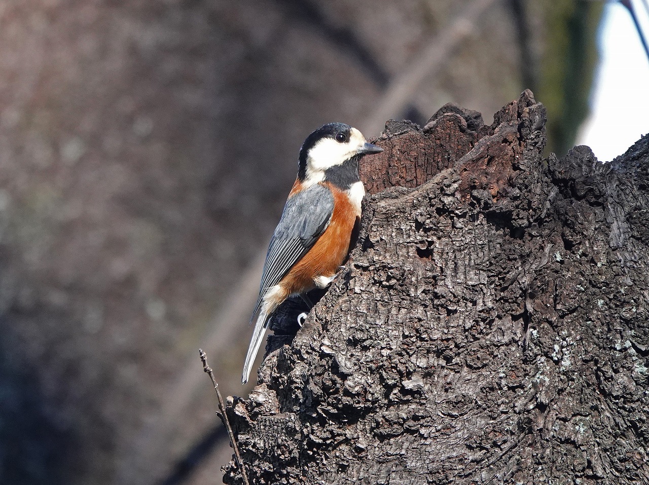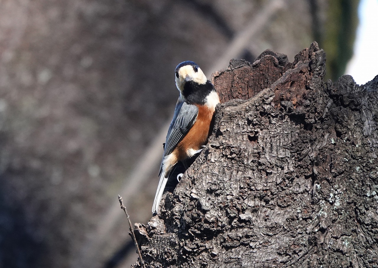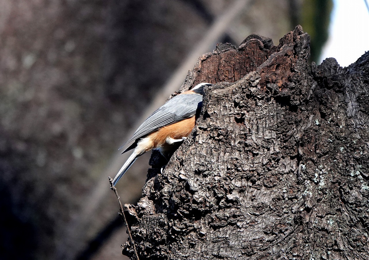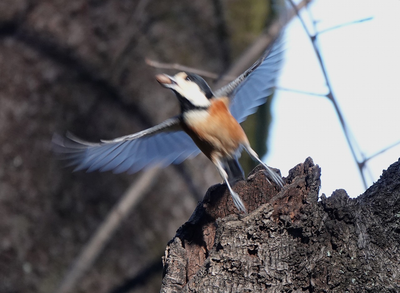 ヤマガラが木の洞にしきりに頭を突っ込んでいた。まるでキツツキが巣作りをしているようで??? そうするうちに、いきなり飛んでシャッタースピード、ピントとも合わせられなかったが、種をくわえていたのは確認できた。この鳥は、つぎはぎだらけの縫いぐるみみたいな風貌にもかかわらずいたって記憶力がよく、あちこちにエサを隠す「貯食行動」で知られている。木の洞をつついていたのは過去に自から隠した種を記憶を辿って探していたのだ。この種はおそらくヤマガラ御用達のエゴノキの種で実に毒があるため他の鳥は敬遠して食べないが、その中の種には毒がないことをヤマガラは知っているのか冬季用の保存食としてあちこちに隠しているらしい。他の小鳥たちに比べ圧倒的に寿命が長い(10年と言われている)のもこのあたりが要因の一つだろう。